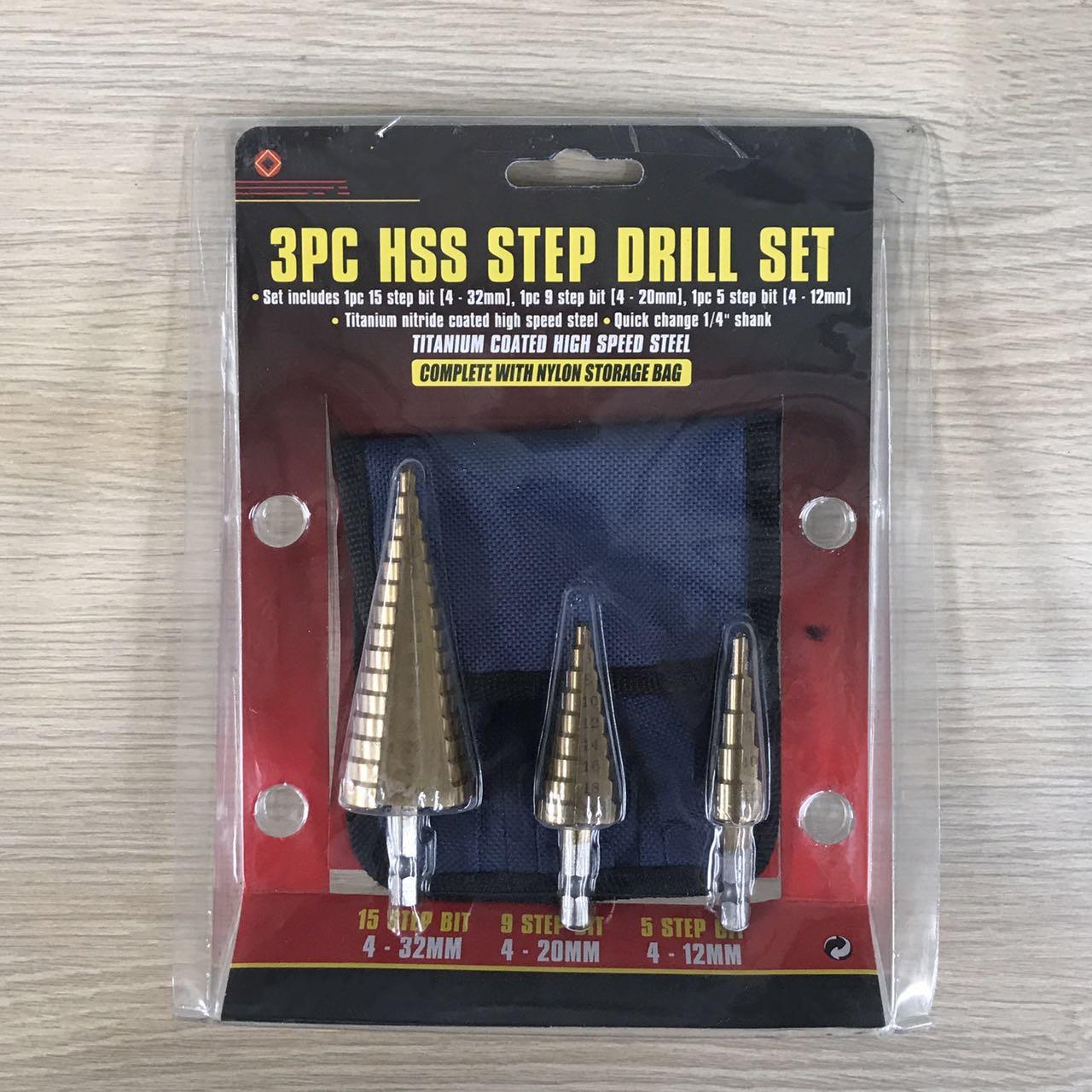 Nome do produto: Três brocas grandes escalonadas em embalagem blister de saco de pano métrico