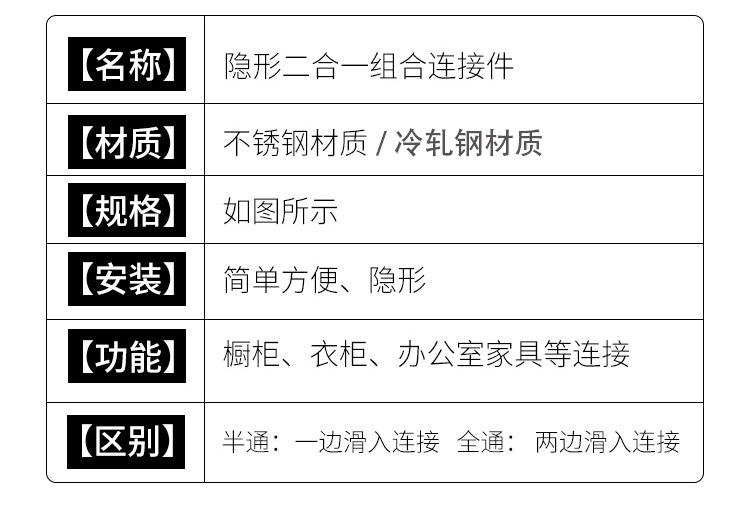 Conector invisível dois em um espessado, fivela de parafuso oculta, instalação sem furos em armários, peças de montagem de móveis endurecidas, vendas diretas de fábrica, conector invisível dois em um para móveis, combinação de fechos ocultos mãe e filho, fivela deslizante completa e meia passagem