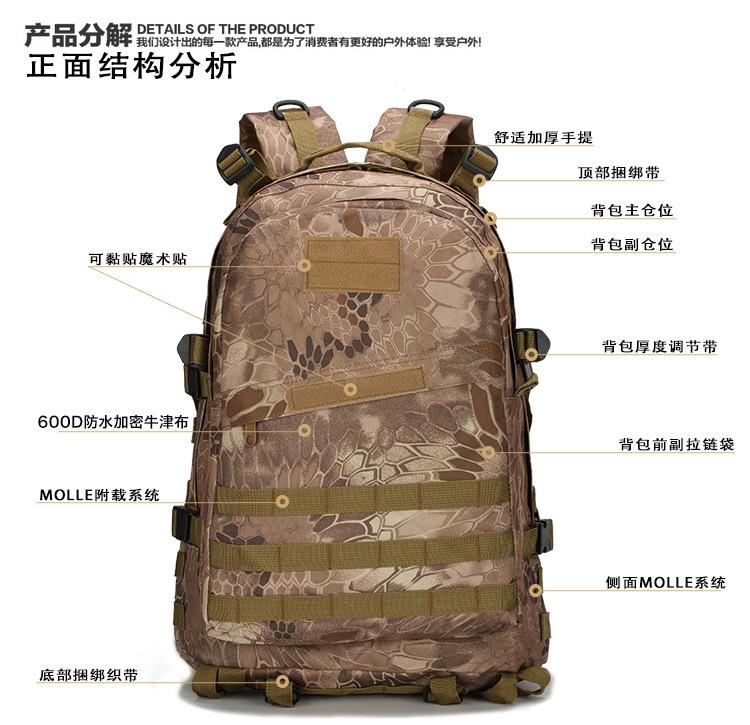 【introducir】La mochila 3D es una mochila utilizada para llevar equipo de viaje para 3 días, comida y artículos personales. Esta mochila está basada en la mochila A-III y añade un sistema de correas MOLLE en el exterior de la mochila, lo que facilita el montaje de otras bolsas pequeñas y la hace más cómoda de usar. La mochila en sí tiene tres capas, una bolsa principal, una bolsa auxiliar de dos tercios de tamaño y una bolsa auxiliar pequeña en el exterior. También hay una bolsa de forro dentro de la bolsa principal, que puede contener una bolsa de agua de 3 litros. La correa para el hombro tiene un forro de EVA para mejorar la comodidad al llevarla. La correa de cintura se puede ajustar en longitud y se puede desmontar y montar según sea necesario. El cuerpo de la mochila está hecho de tela de nailon de alta calidad, que es ligera y tiene una excelente resistencia al desgaste; las correas y todas las costuras en los materiales auxiliares están hechas de material de nailon de estándar militar, que es de alta resistencia y asegura que no se pudrirá después de mojarse.