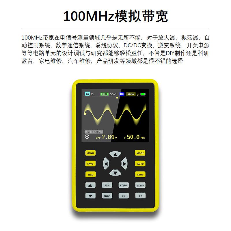 El FNIRSI-5012H es un osciloscopio portátil versátil, altamente práctico y rentable para la industria del mantenimiento y la industria de I+D con la tasa de muestreo en tiempo real de FNIRSI de hasta 500MS/s y 100MHz de ancho de banda analógico. Con función de disparo completa (único, normal, automático), se puede utilizar libremente tanto para señales analógicas periódicas como para señales digitales no periódicas. El módulo de protección de alto voltaje incorporado puede soportar hasta 400V de voltaje continuo y 600V de voltaje pico. No hay necesidad de preocuparse por el quemado del osciloscopio causado por el alto voltaje al no sondear a la posición 10X. Modo de escaneo de base de tiempo grande que monitorea cambios de nivel lentos. Equipado con AUTO de un botón de alta eficiencia, la forma de onda medida se puede mostrar sin ajustes complicados. Pantalla LCD de alta definición con tecnología IPS de visión completa de 2.4 pulgadas y resolución 320*240, el efecto visual es muy bueno. Función de almacenamiento de forma de onda extremadamente conveniente y rápida, espacio de almacenamiento integrado de 64M, puede almacenar hasta 2000 imágenes de forma de onda, el proceso de almacenamiento es simple y rápido, guarde la forma de onda actual en cualquier momento y en cualquier lugar, solo con un toque, sin indicaciones ni opciones engorrosas. Potente administrador de archivos de forma de onda, soporte para navegación en miniatura, visualización, visualización detallada, cambio de página, eliminación y más. Batería de litio de alta calidad de 5000mah incorporada, se puede usar continuamente durante 12 horas cuando está completamente cargada. El cuerpo está equipado con una funda protectora de silicona de alta calidad, protección ambiental no tóxica y sin plomo, antideslizante, antichoque y a prueba de golpes, protección integral del fuselaje, textura suave, se siente muy cómoda.