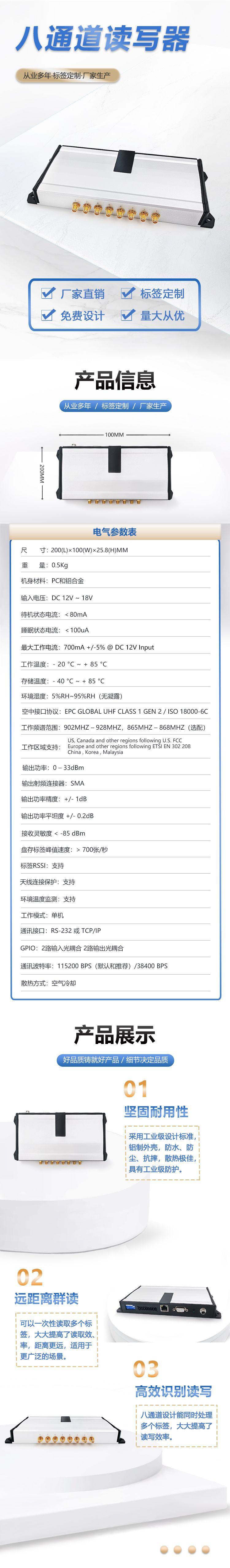 O design de oito canais permite que o leitor processe várias tags ao mesmo tempo, melhorando muito a eficiência de leitura e escrita. O uso de algoritmos de processamento de sinal eficientes e excelentes chips RF garantem uma alta taxa de reconhecimento.