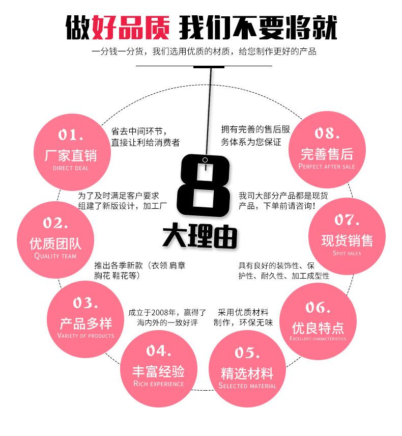 Vantagem:Lançamos novos estilos a cada estação (colares, dragonas, corsages, decorações para sapatos, etc.). Visitamos os principais mercados nacionais e estrangeiros de materiais auxiliares todos os anos para coletar novas informações dos principais mercados de materiais auxiliares. Temos dezenas de milhares de variedades e dezenas de milhões de produtos. Enviamos rapidamente. Se você fizer um pedido hoje, podemos enviá-lo amanhã, o que permite que os clientes concluam as transações mais rapidamente.