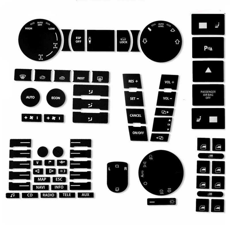 -Um conjunto de adesivos para reparar os botões do seu carro com unidade AC. Composto por vinil opaco recortado, você pode repor o visual agradável que tinha quando novo.