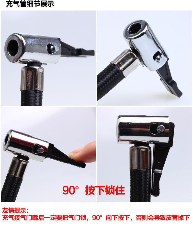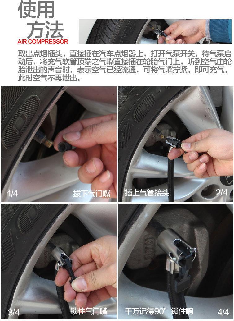【Instrucciones】Retire el enchufe del encendedor e insértelo directamente en el encendedor del automóvil. Encienda el interruptor de la bomba de aire. Una vez que la bomba de aire se encienda, inserte la boquilla de aire en la parte superior de la manguera de inflado directamente en la válvula del neumático. Cuando escuche el sonido de una fuga de aire del neumático, significa que el aire ha circulado y puede apretar la boquilla para inflar. En ese momento, el aire ya no saldrá.