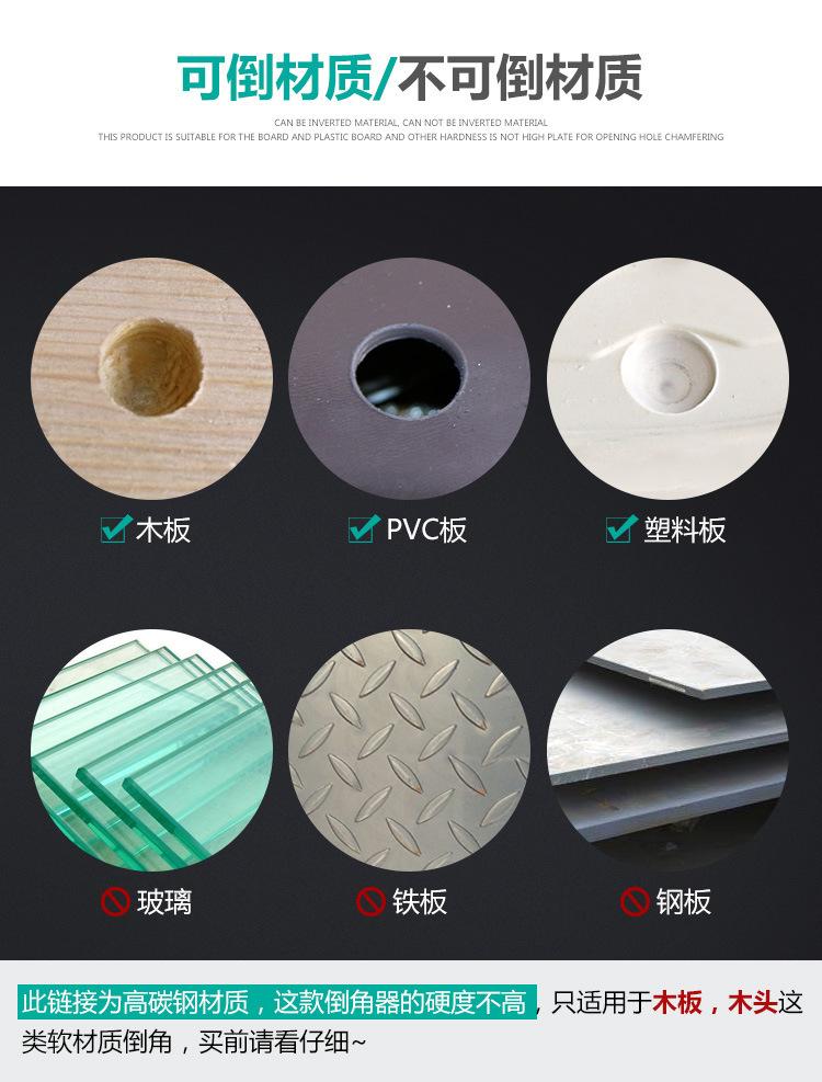 Ámbito de aplicación: Este producto es adecuado para taladrar y avellanar tableros de baja dureza como tableros de madera y tableros de plástico.¡Nunca use este producto para achaflanar metal! ! !