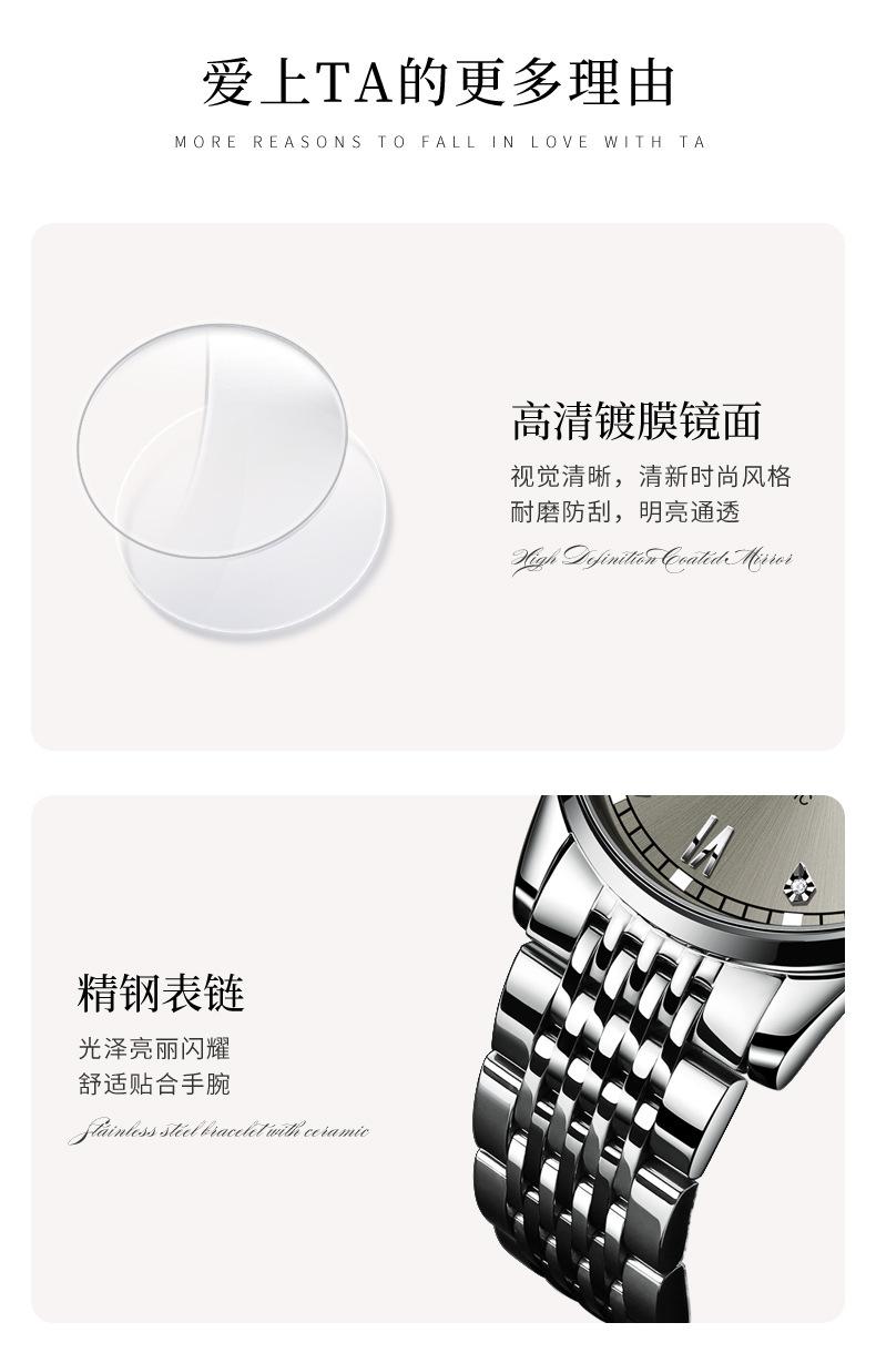El reloj está exquisitamente elaborado, incomparable con productos de decenas de yuanes. Prestamos atención a la calidad de los detalles, utilizamos exclusivamente movimientos de alta calidad y empleamos artesanía de alta calidad para el pulido y la galvanoplastia de la caja. Nuestra reputación en ventas internacionales y nacionales es muy buena. ¡La calidad no teme a las comparaciones! Nuestra filosofía es que, en lugar de fabricar productos de baja calidad para ahorrar unos pocos yuanes y causar muchos problemas de posventa, es mejor invertir en calidad y ahorrarse el trabajo de posventa. En comparación, esto permitirá a los distribuidores obtener mayores márgenes de beneficio y a los consumidores obtener mejores productos.