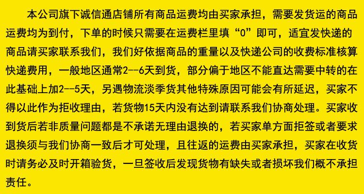 (2): Nossos produtos são todos itens grandes, e nosso objetivo é reduzir os lucros. Todos os custos de frete são suportados pelo comprador. Nós usamos a logística comum como padrão, e recomendamos que os compradores escolham a logística de frete comum. A logística precisa ser retirada na cidade, e o frete é pago. Após o comprador fazer o pedido do produto, entre em contato com o atendimento ao cliente para perguntar sobre o frete e qual empresa de logística escolher. Se a entrega expressa for necessária, explique especificamente ao atendimento ao cliente. Os custos de entrega expressa são caros e não são recomendados. Se não entrarmos em contato com o cliente para verificar a situação da logística, nossa empresa entrará em contato com a empresa de logística para enviar as mercadorias aleatoriamente.
