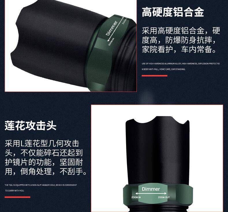 Material da lente: lente UCL de revestimento duplo importada de alta qualidade, com forte transmitância de luz. Zoom rotativo patenteado, girando o anel de foco na cabeça, você pode controlar o tamanho da abertura de acordo com as necessidades de longo alcance ou iluminação com holofotes.