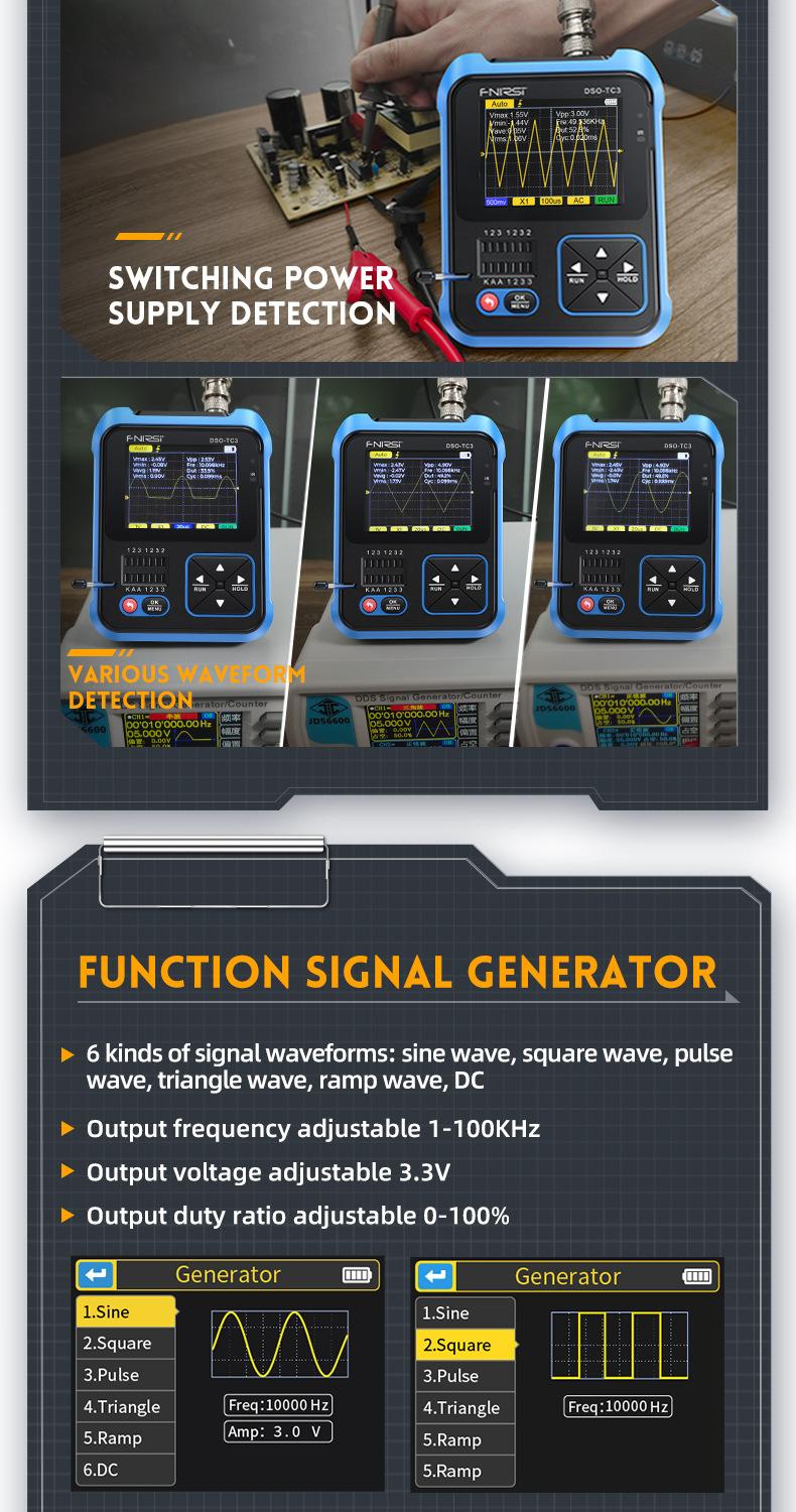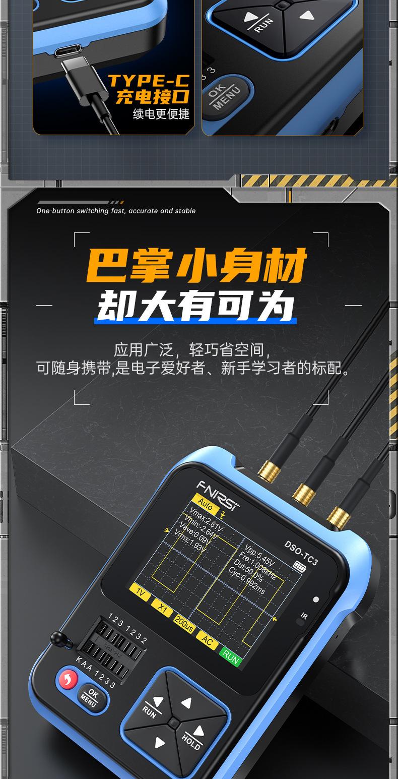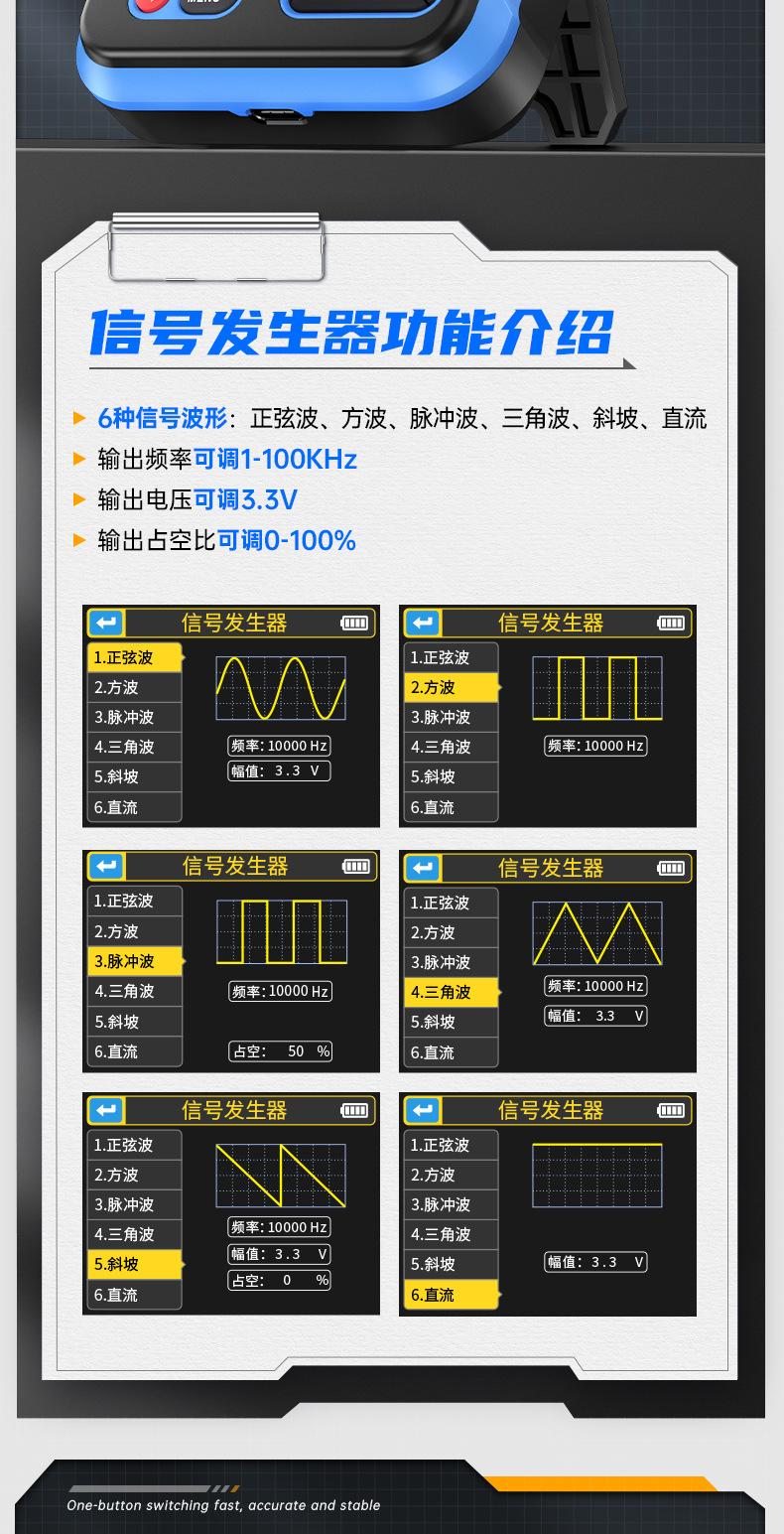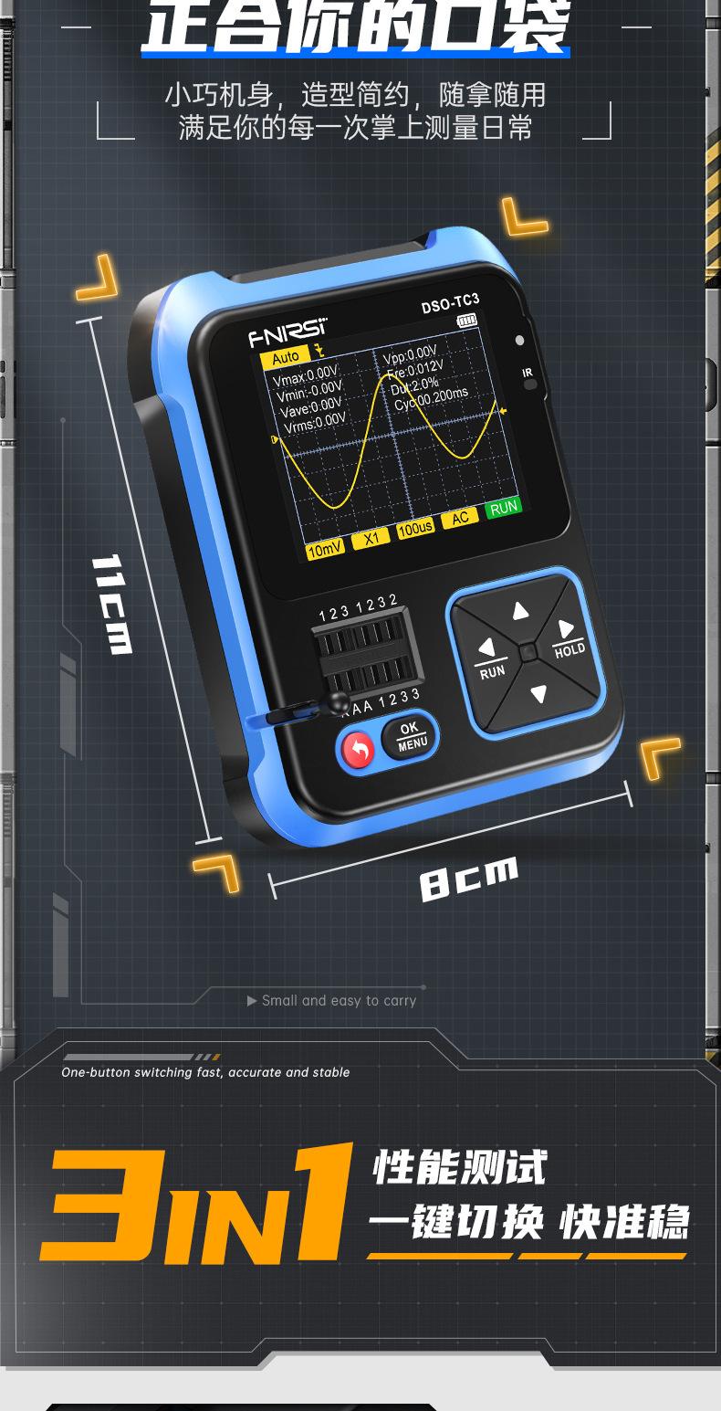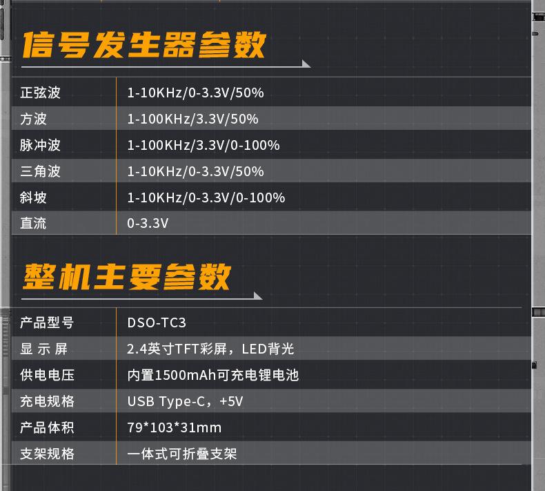 O DSO-TC3 expandiu o intervalo de teste com base no TC2. Por exemplo, a largura de banda da função osciloscópio foi aumentada para 500KHZ, e a função geradora de sinal foi adicionada.
