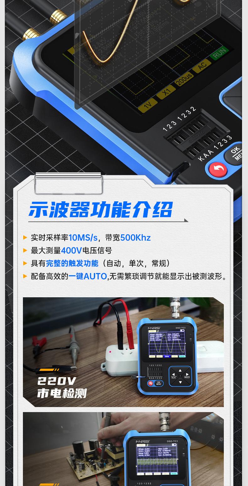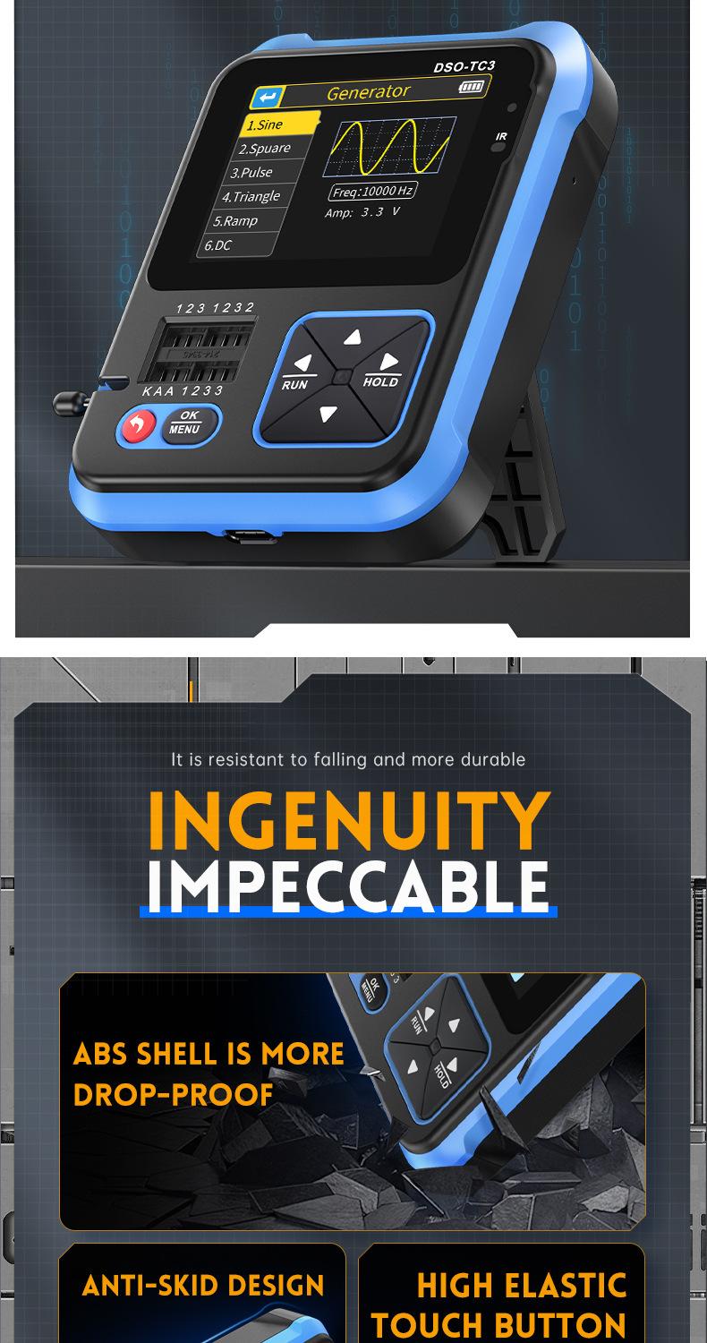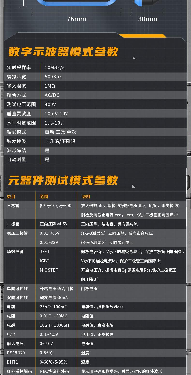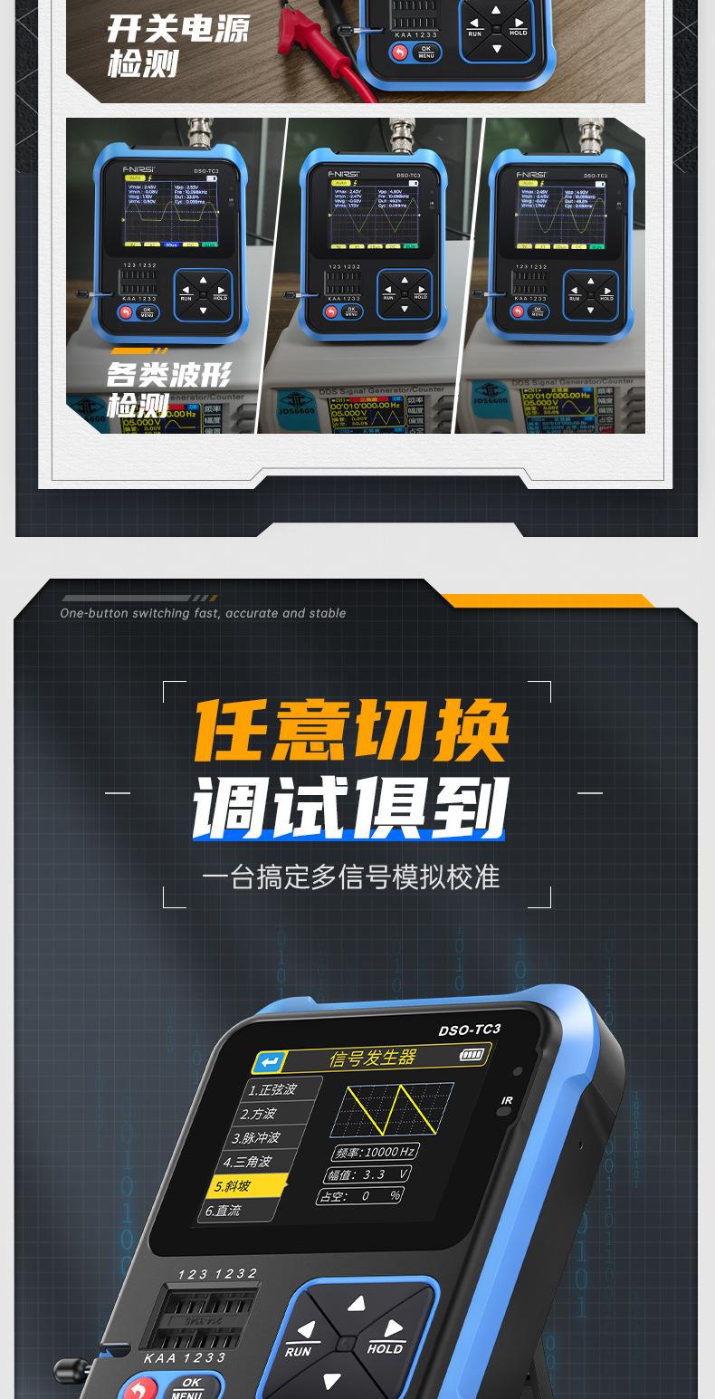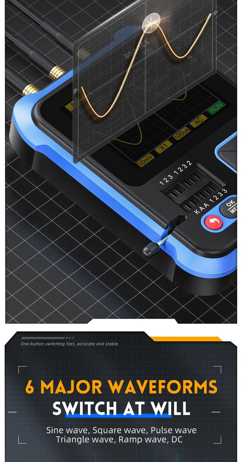 O DSO-TC3 expandiu o intervalo de teste com base no TC2. Por exemplo, a largura de banda da função osciloscópio foi aumentada para 500KHZ, e a função geradora de sinal foi adicionada.