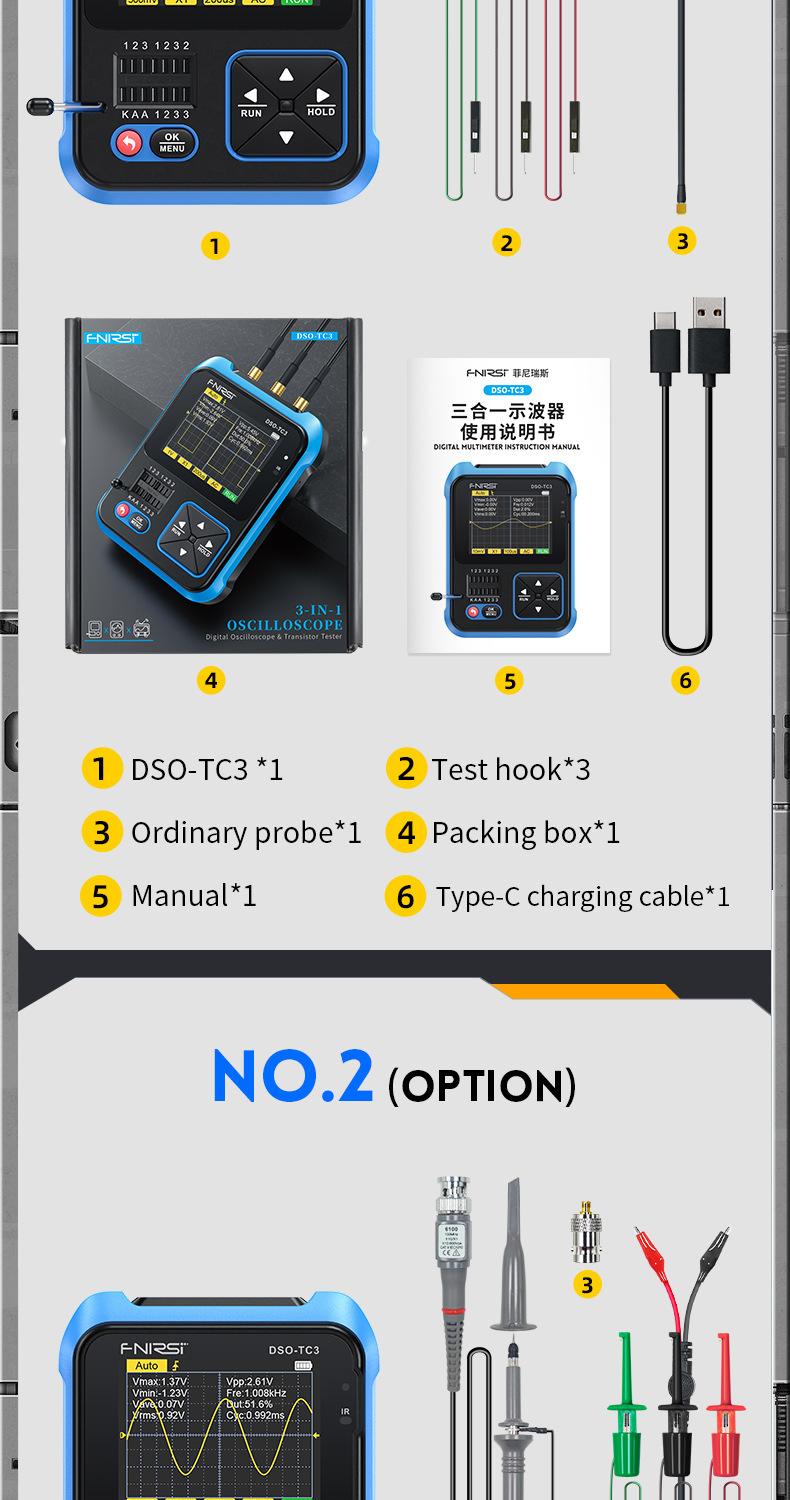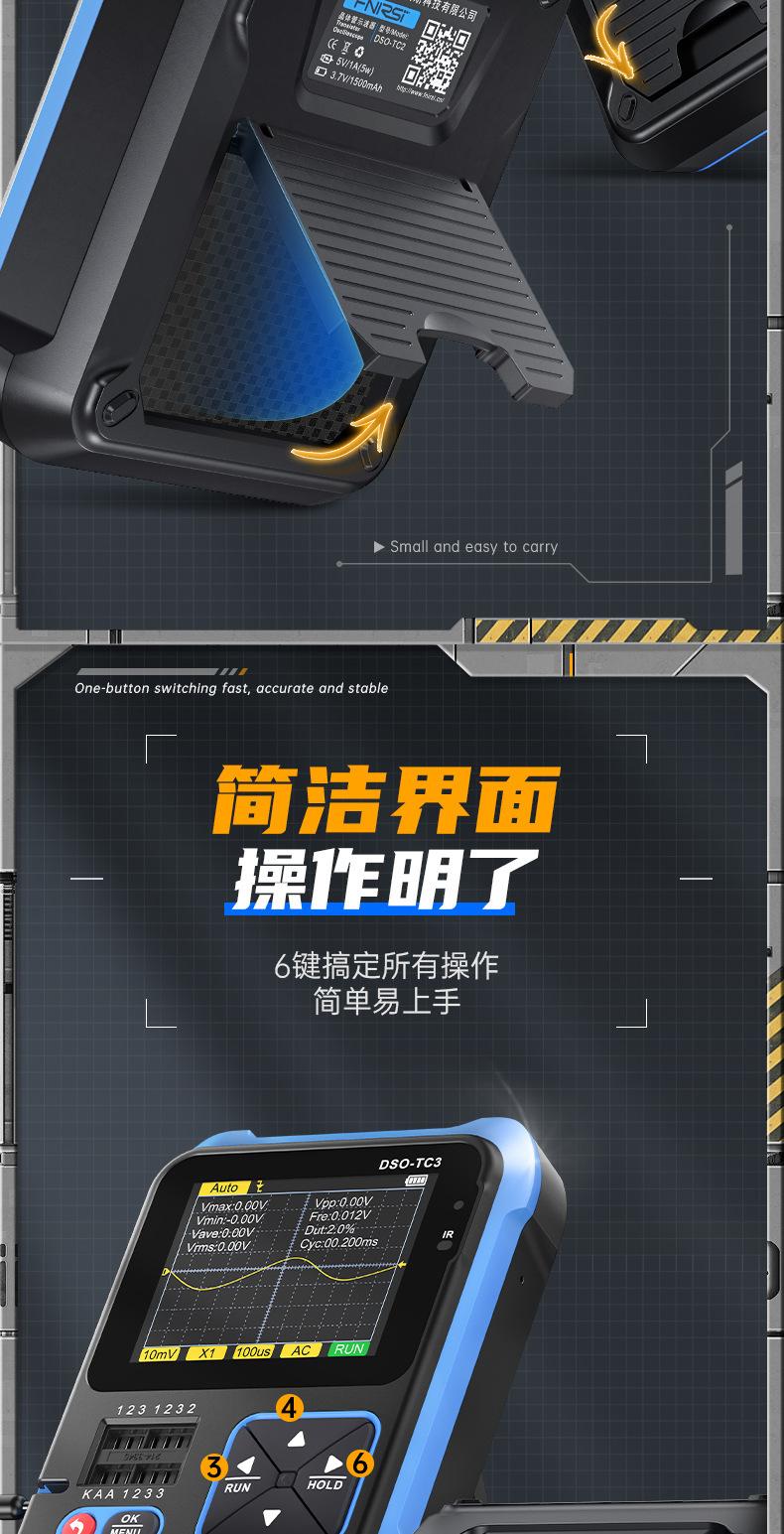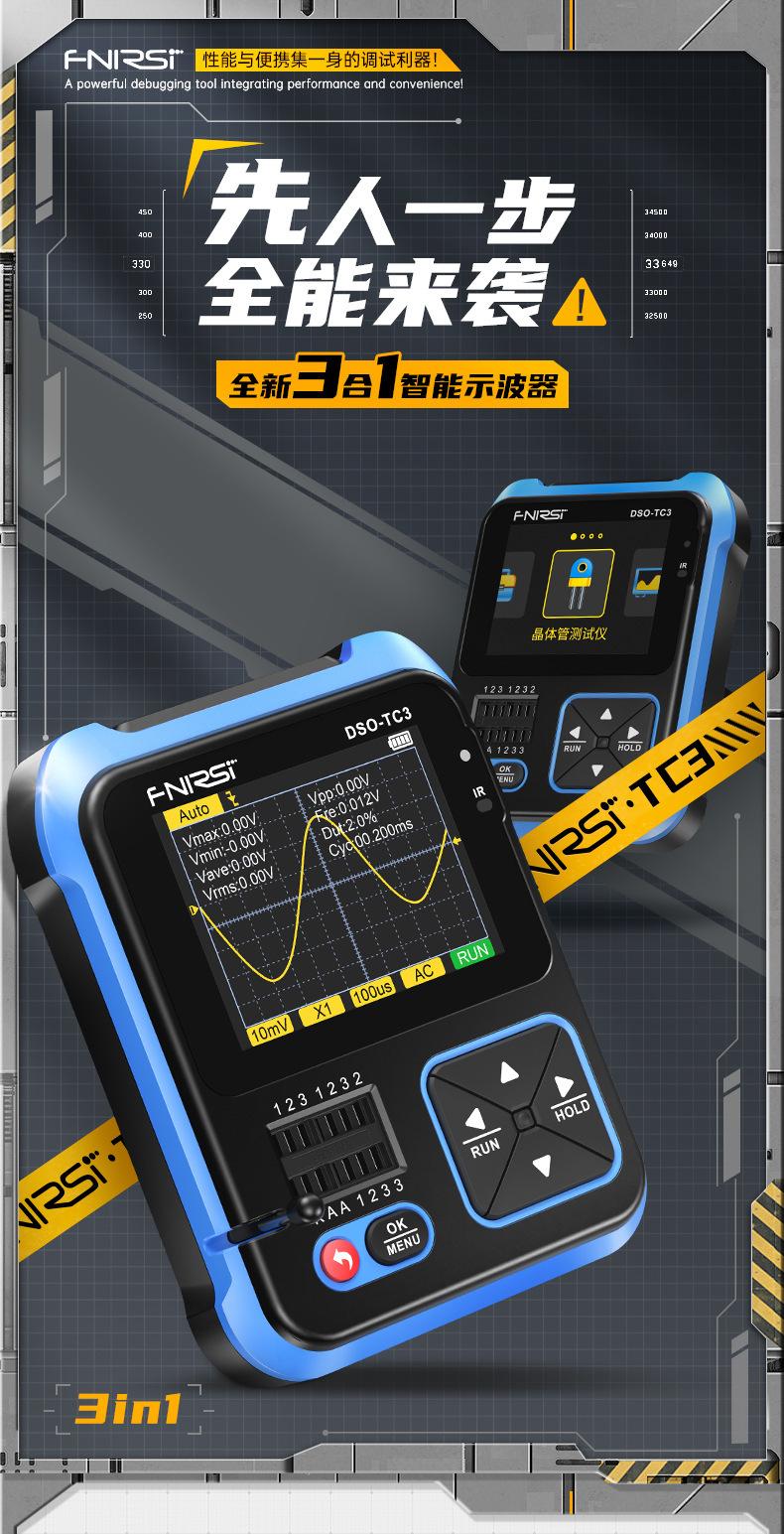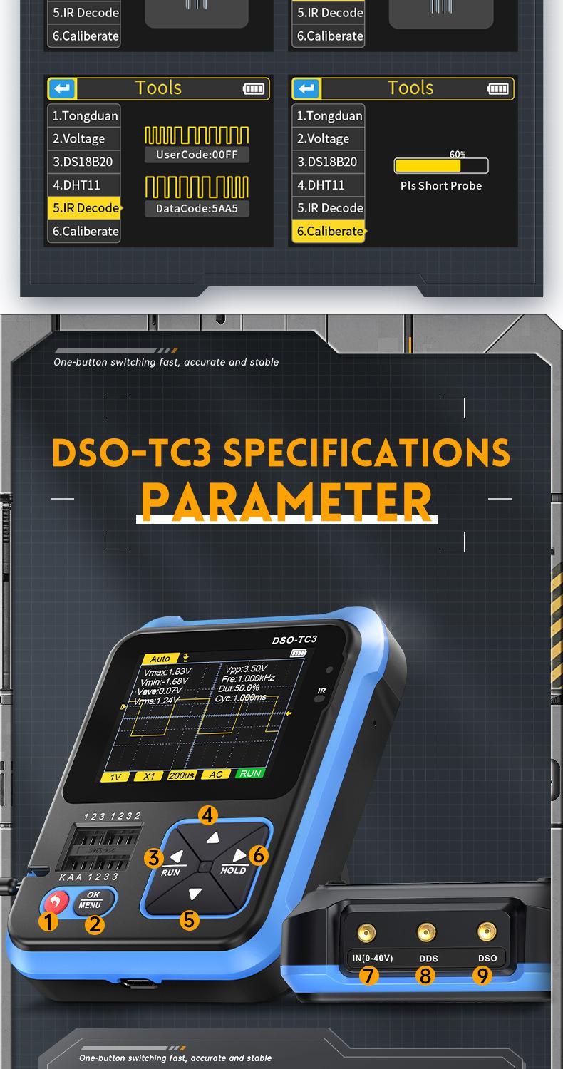 O DSO-TC3 expandiu o intervalo de teste com base no TC2. Por exemplo, a largura de banda da função osciloscópio foi aumentada para 500KHZ, e a função geradora de sinal foi adicionada.