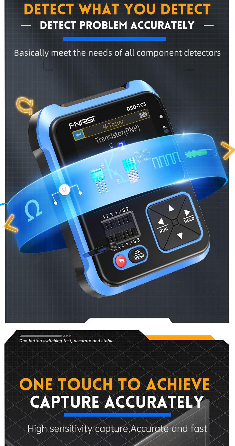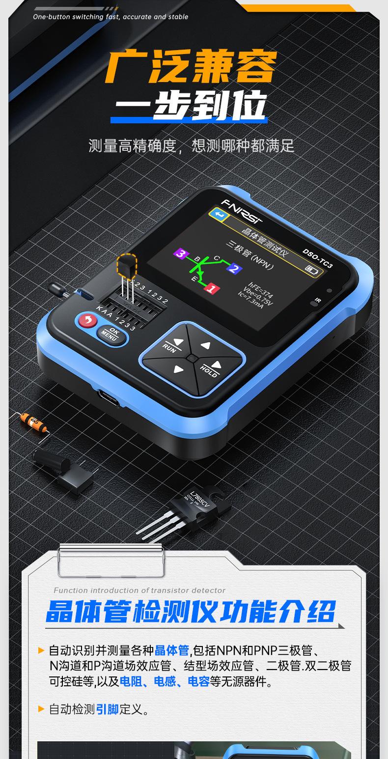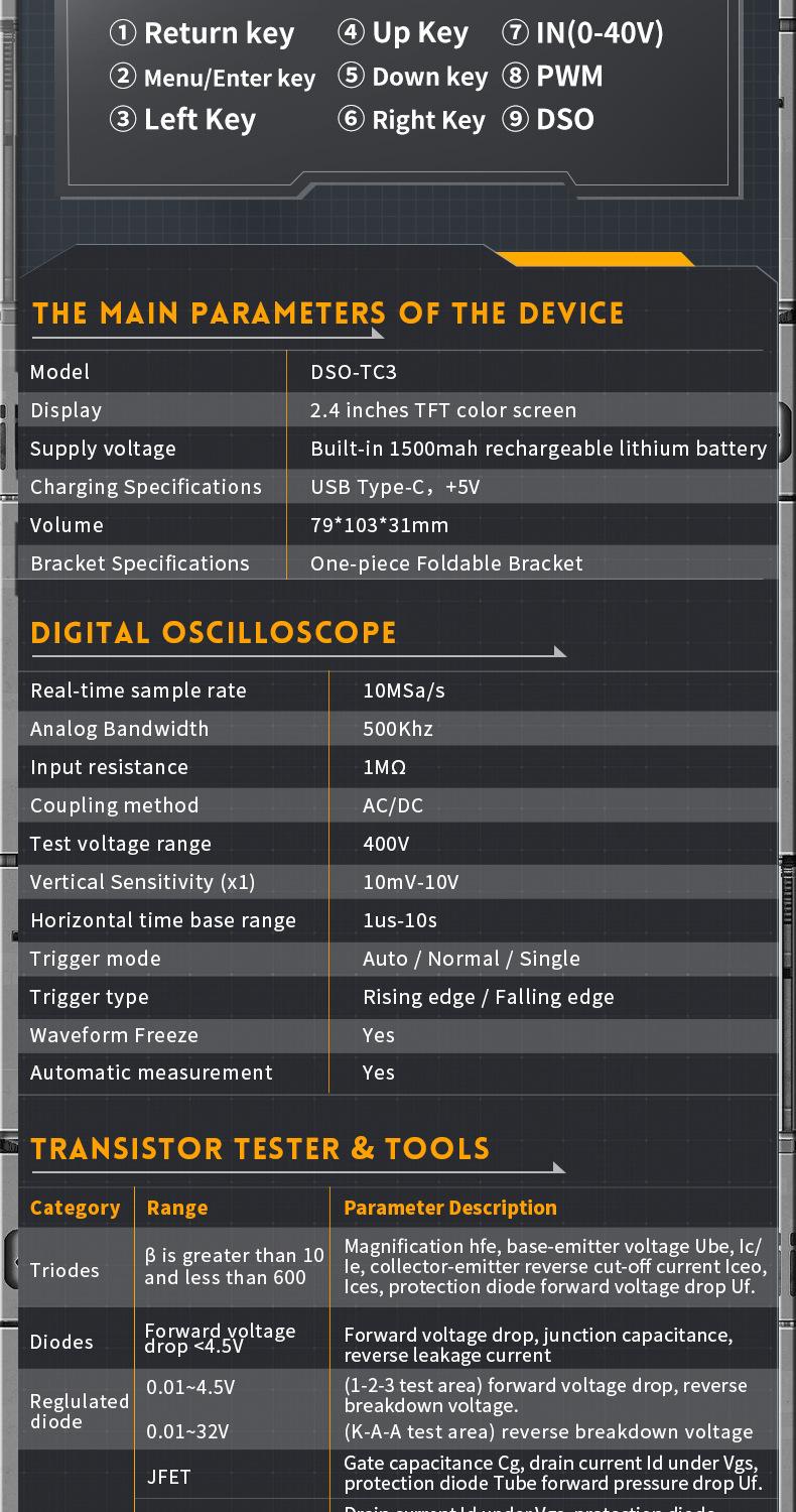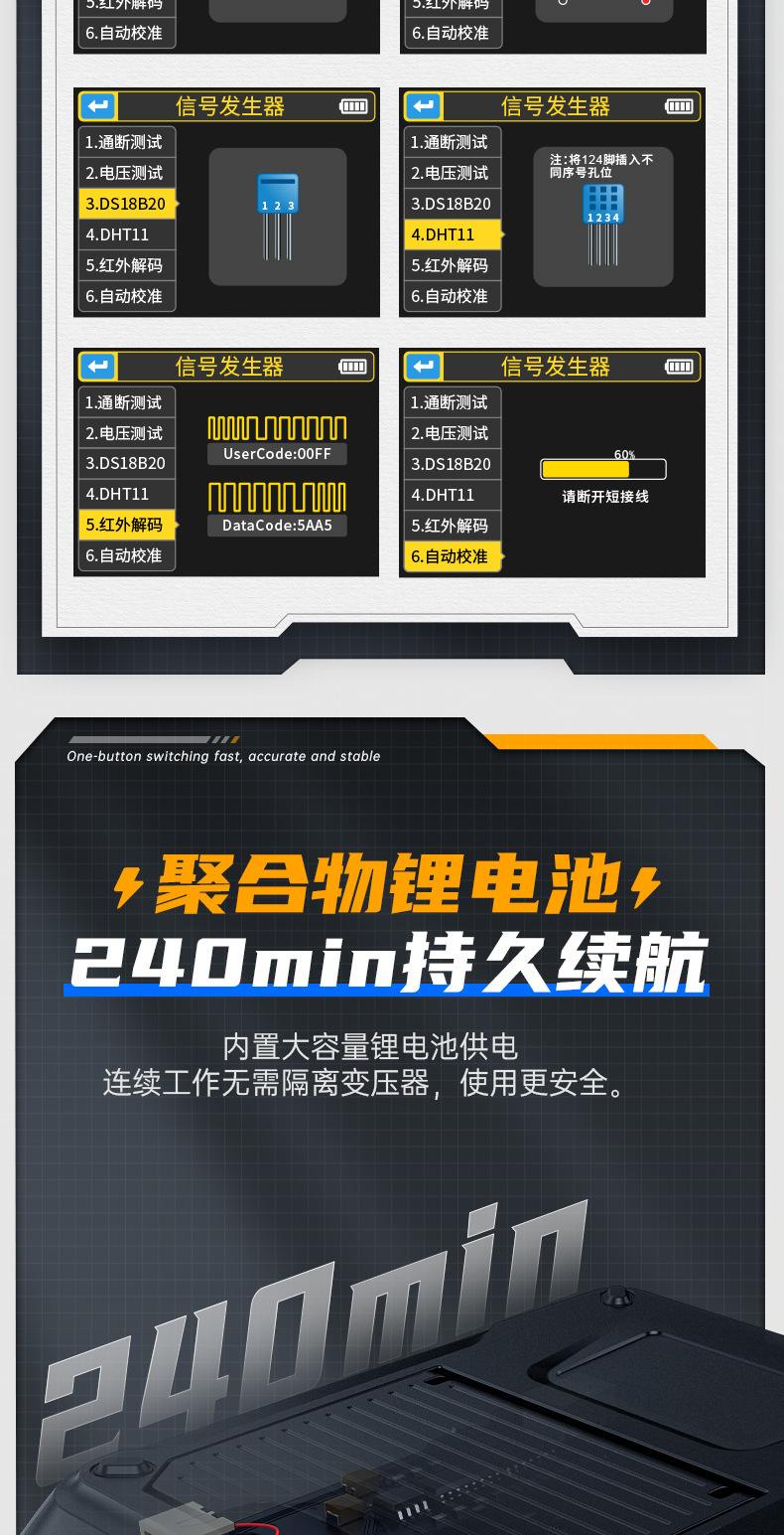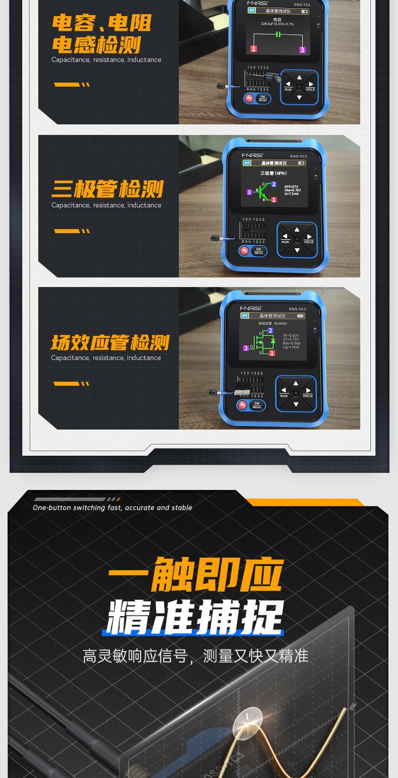 O DSO-TC3 expandiu o intervalo de teste com base no TC2. Por exemplo, a largura de banda da função osciloscópio foi aumentada para 500KHZ, e a função geradora de sinal foi adicionada.