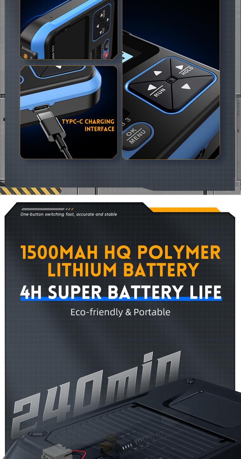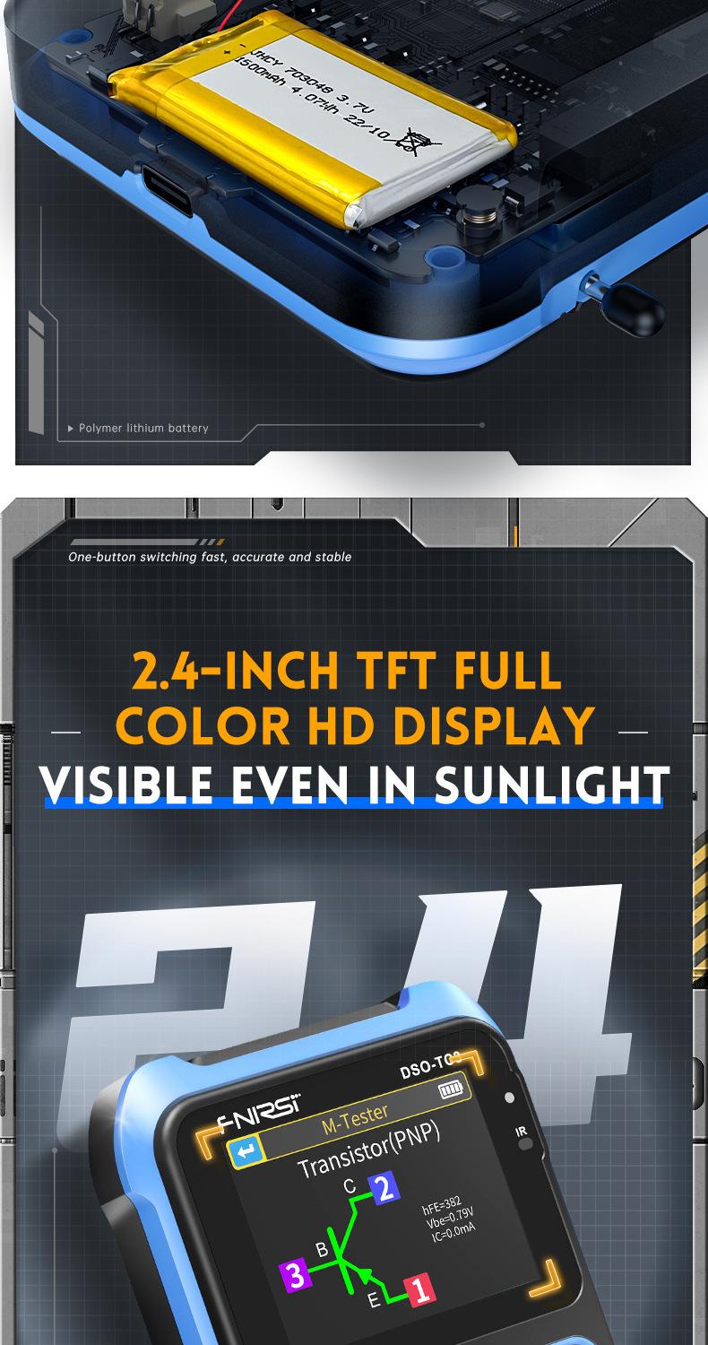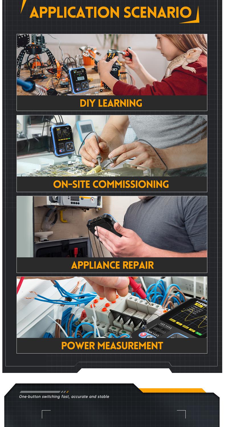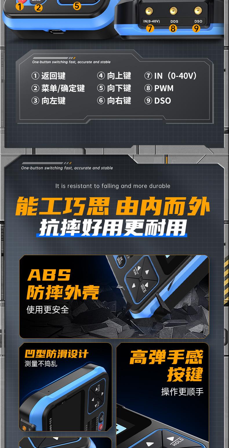 O DSO-TC3 expandiu o intervalo de teste com base no TC2. Por exemplo, a largura de banda da função osciloscópio foi aumentada para 500KHZ, e a função geradora de sinal foi adicionada.