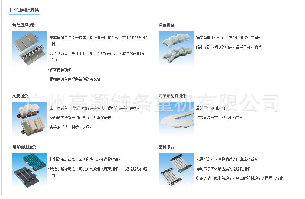 Ofrecemos cadenas superiores de plástico que reducen los arañazos en los objetos transportados, y cadenas superiores de acero inoxidable que son excelentes en resistencia a la corrosión y adecuadas para transportar objetos pesados.