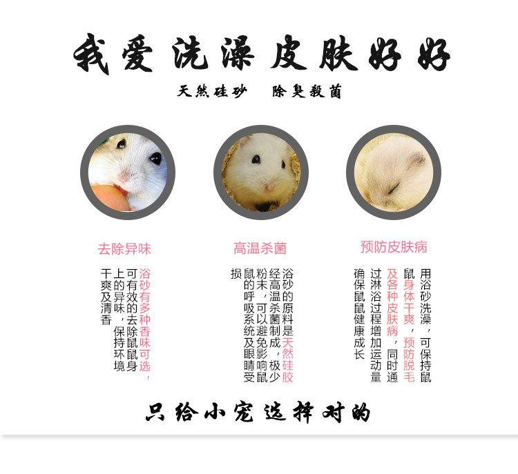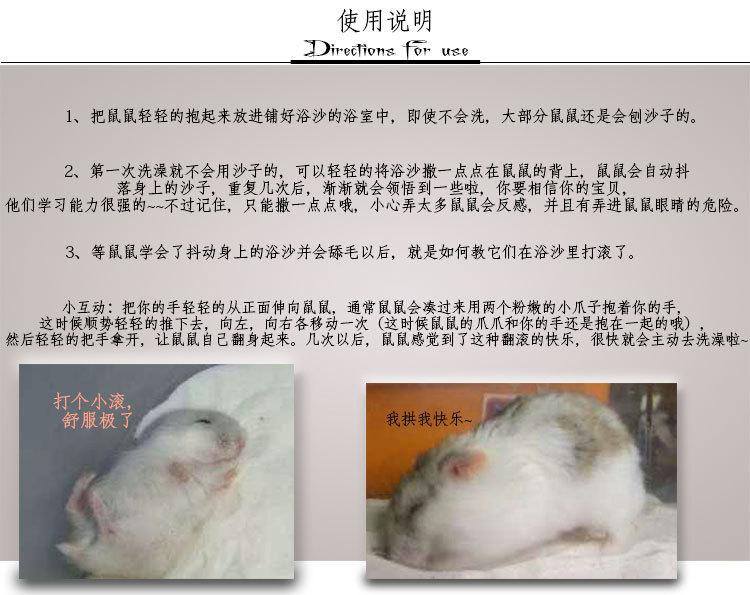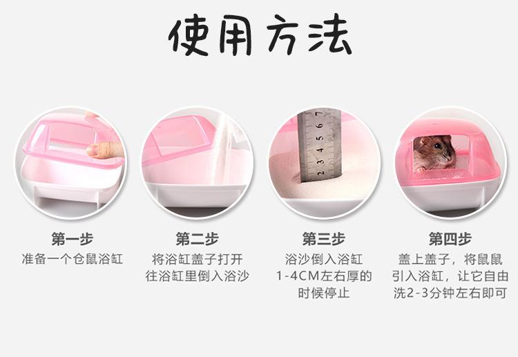 Modo de usar: 1. Enxágue primeiro o banheiro do hamster e, em seguida, despeje cerca de 100g de areia de banho (ajustável de acordo com o tamanho do hamster)