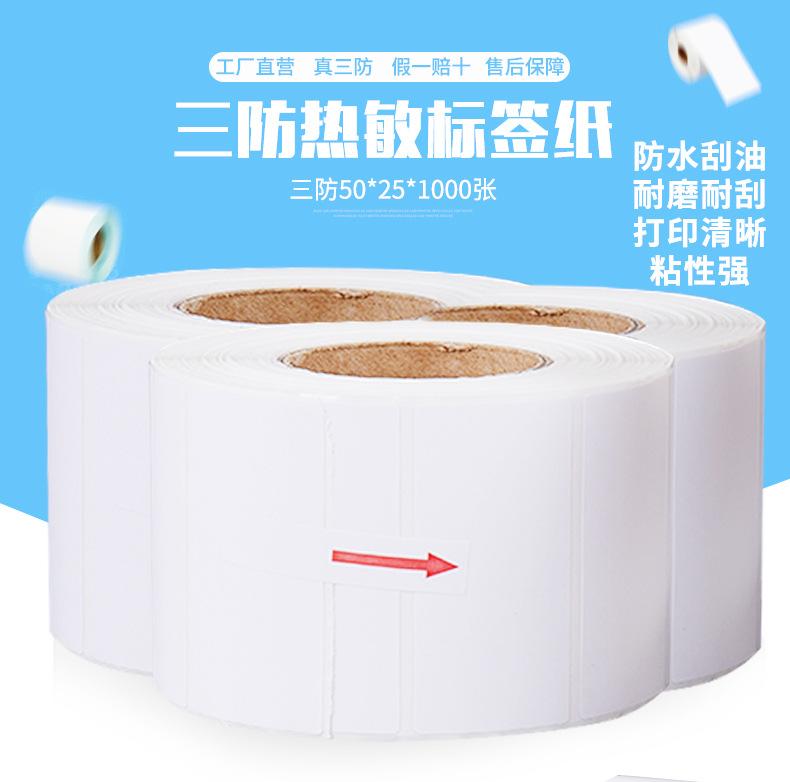 Etiqueta de papel térmico de tres pruebas en blanco 50*25*1000, impresora de etiquetas adhesivas, papel de código de barras, papel recubierto, etiqueta adhesiva