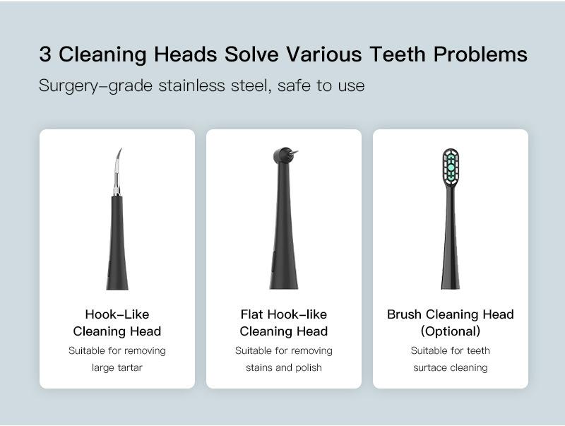 1. Cabeça de limpeza em forma de gancho: adequada para remover pequenos pedaços de cálculo dentário