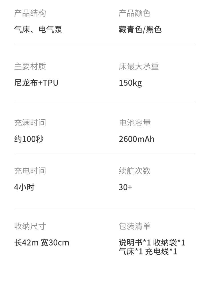 Lista de embalagem: Manual de instruções*1 Bolsa de armazenamento*1 Colchão de ar*1 Cabo de carregamento*1