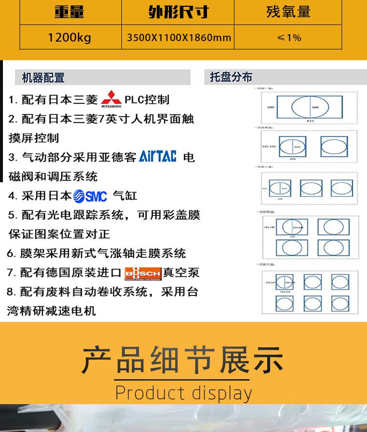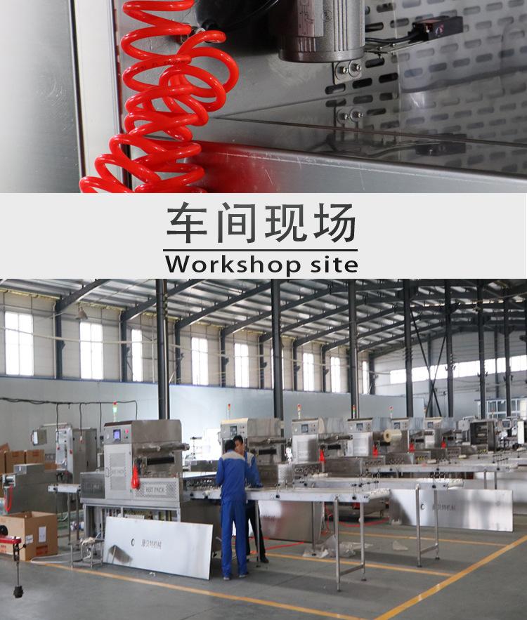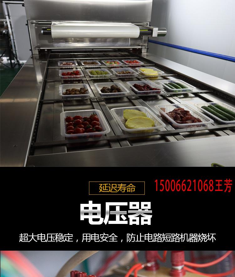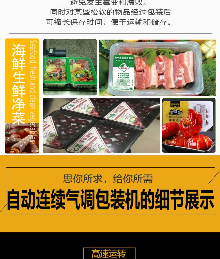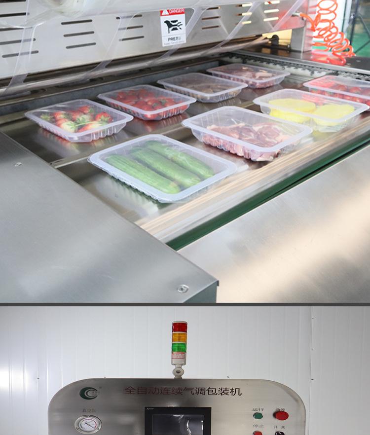 Primeiro, coloque o produto na bandeja e, em seguida, coloque a bandeja na área de descarga do equipamento. A bandeja entra no molde de vedação conforme a corrente avança. O molde sobe e o filme superior é preso à bandeja no molde de vedação. Primeiro, aspire (de acordo com os requisitos de embalagem do produto do usuário, nitrogênio ou gás misto podem ser lavados para embalagem com base na aspiração), sele (o filme superior e a bandeja são selados juntos), perfure e corte e, finalmente, esgote e abaixe o molde. O produto embalado continua a avançar com a corrente e é descarregado da porta de descarga.