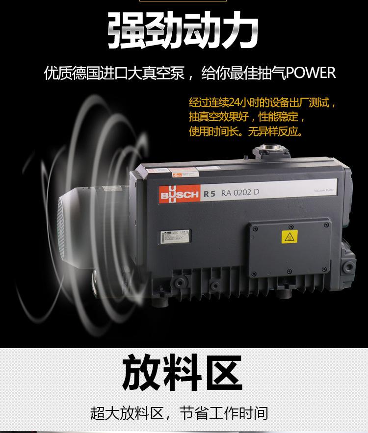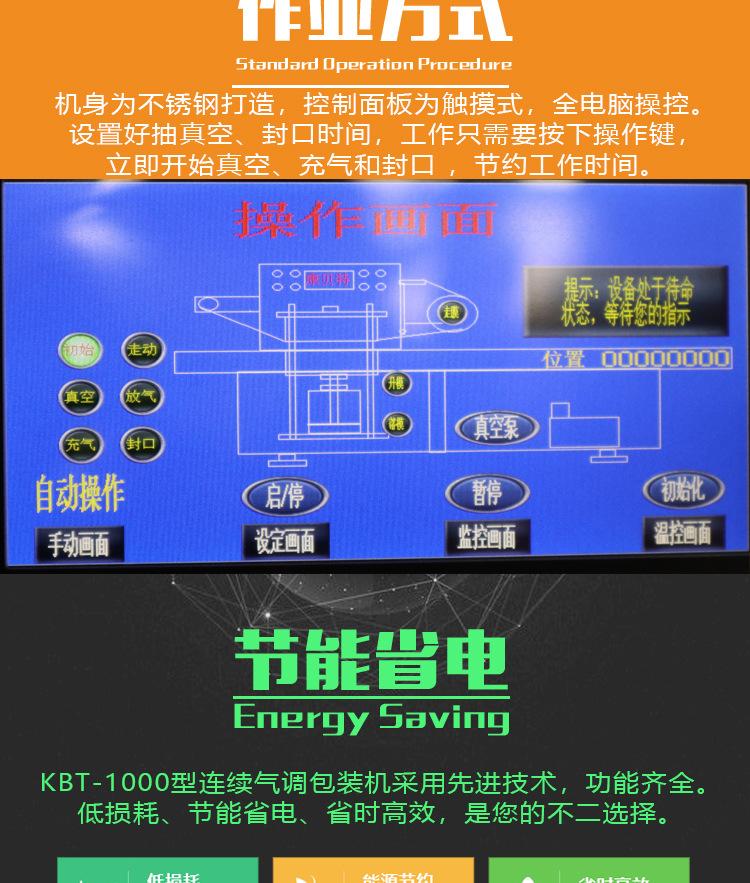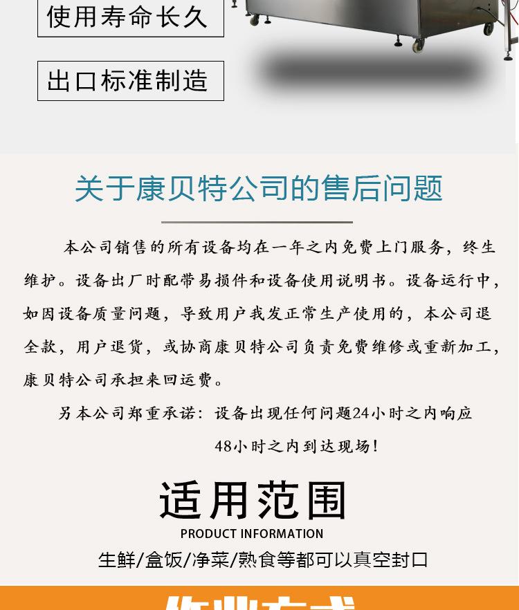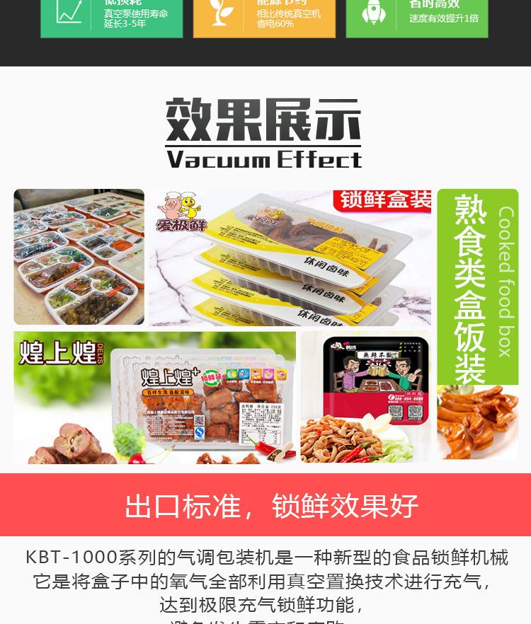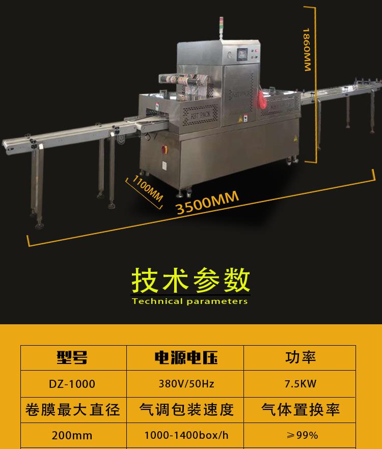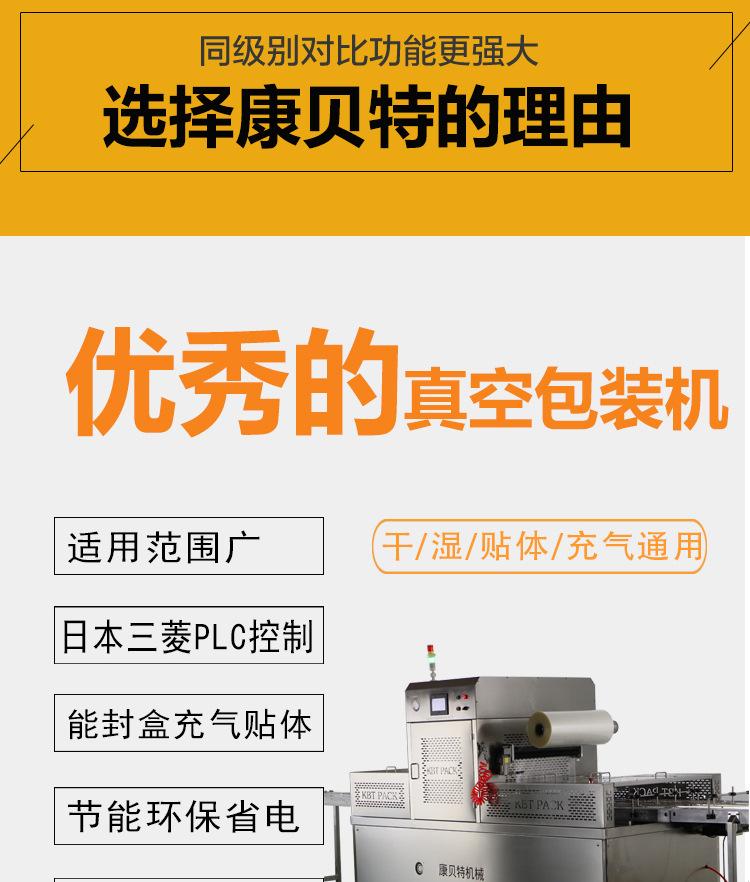 Primeiro, coloque o produto na bandeja e, em seguida, coloque a bandeja na área de descarga do equipamento. A bandeja entra no molde de vedação conforme a corrente avança. O molde sobe e o filme superior é preso à bandeja no molde de vedação. Primeiro, aspire (de acordo com os requisitos de embalagem do produto do usuário, nitrogênio ou gás misto podem ser lavados para embalagem com base na aspiração), sele (o filme superior e a bandeja são selados juntos), perfure e corte e, finalmente, esgote e abaixe o molde. O produto embalado continua a avançar com a corrente e é descarregado da porta de descarga.