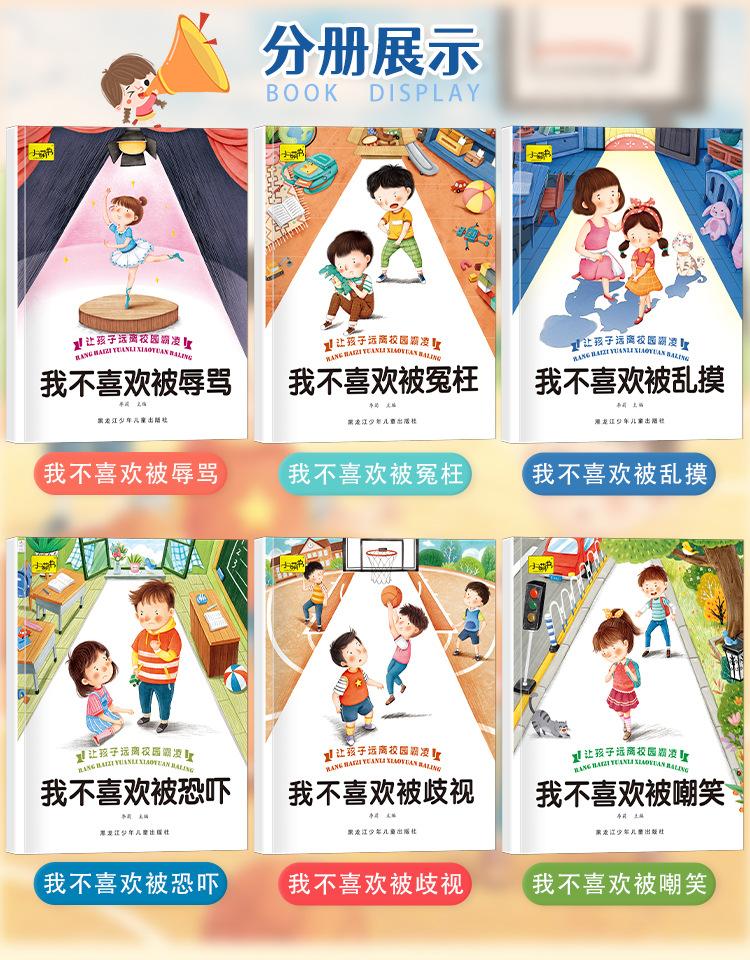 Nombre del producto: Mantener a los niños alejados del acoso escolar (un juego de 6 libros), tamaño: 17*21cm, número de páginas: 24 páginas por libro, un juego de 6 libros, peso por juego: 0.41kg, precio: 118.8 yuanes (6 libros), embalaje: 60 juegos/pieza (24.6kg)