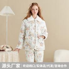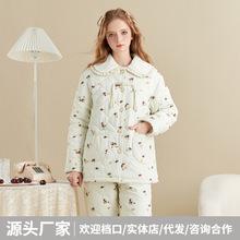 Novo Pijama Acolchoado de Inverno de Três Camadas Feminino Espessurado Quente Forrado com Lã de Algodão Puro Pode Ser Usado Fora Conjunto de Roupa de Casa de Alta Qualidade