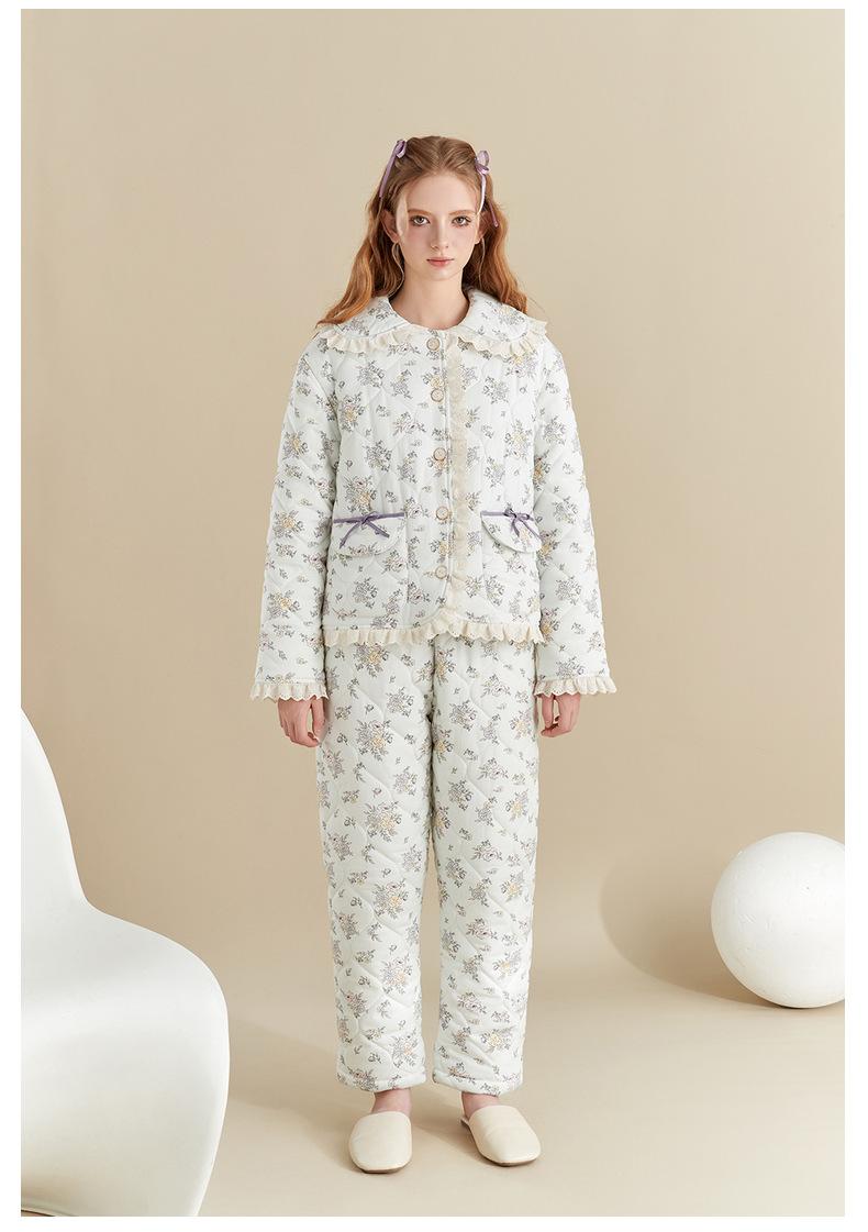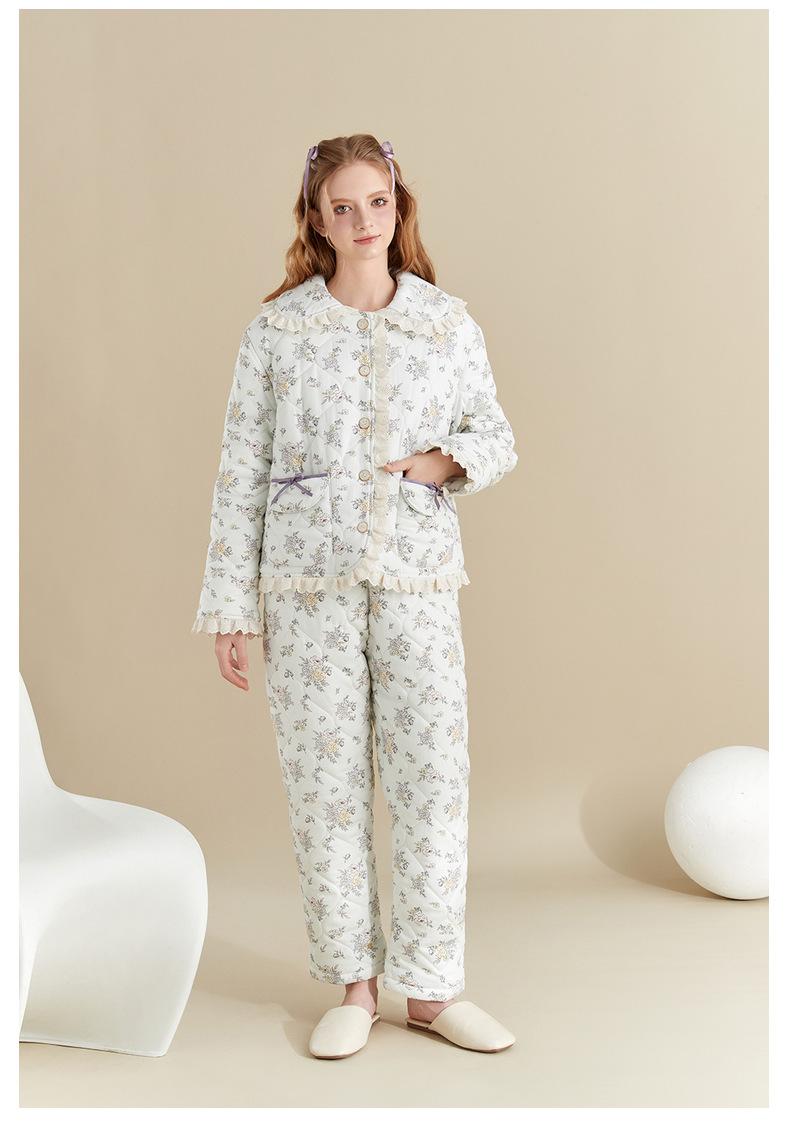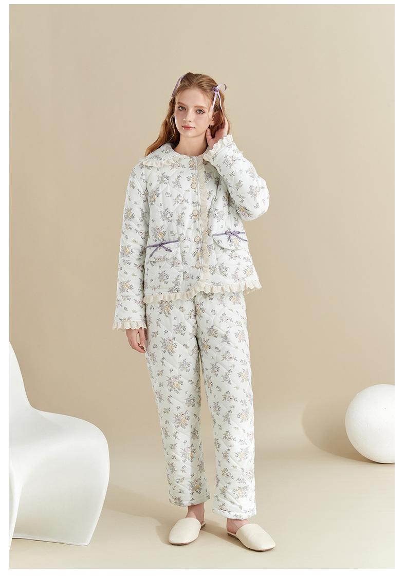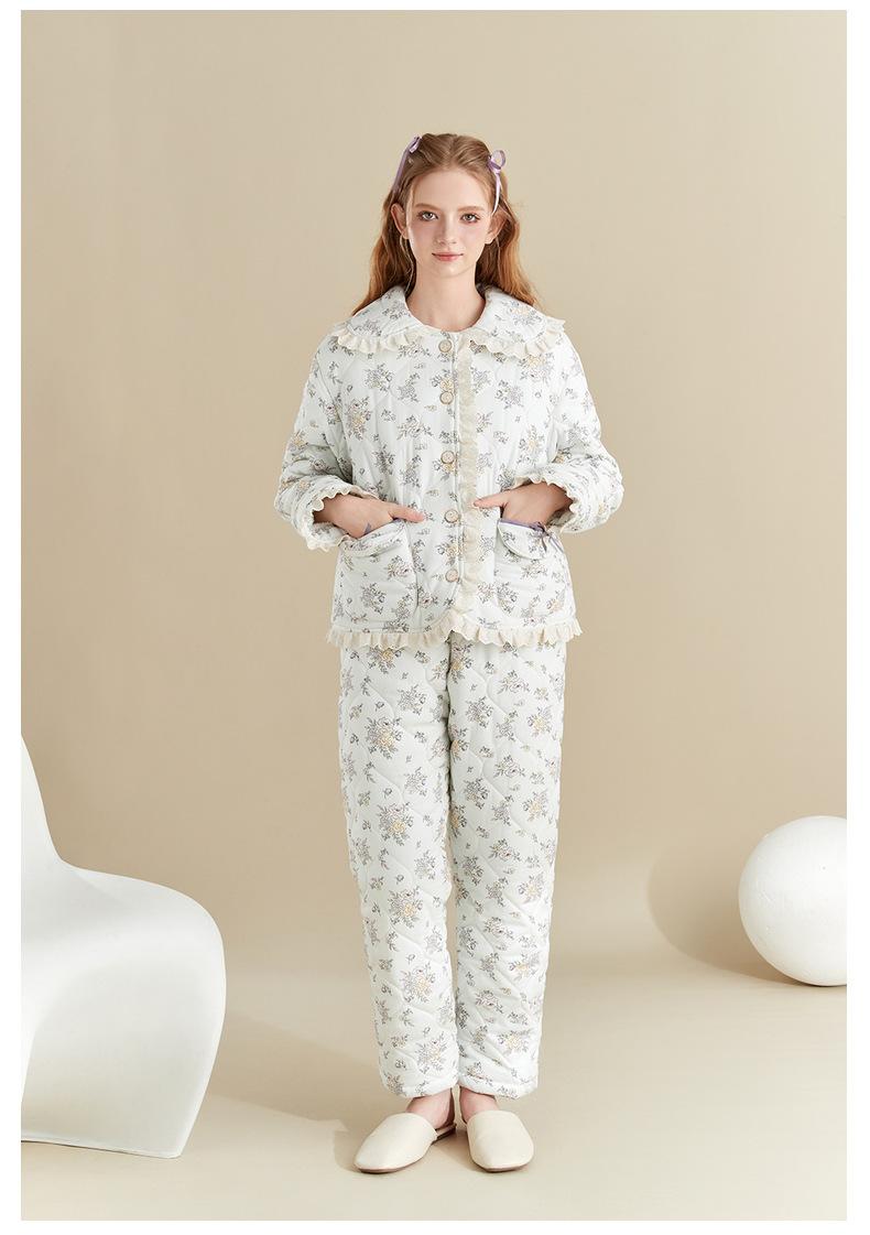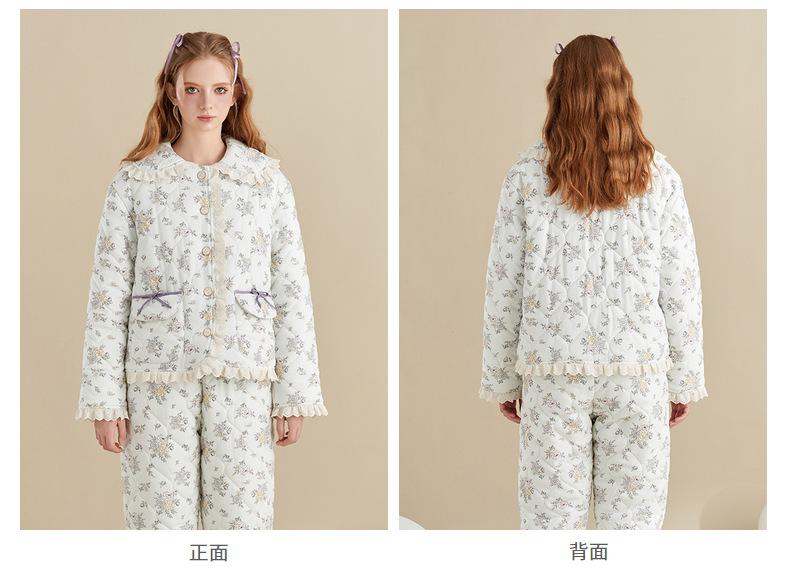 Pijama acolchoado de três camadas de inverno para mulheres com estampas florais, doce e elegante, roupas de casa grossas e quentes para meninas no inverno, ternos para economizar roupas