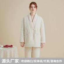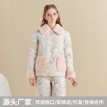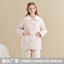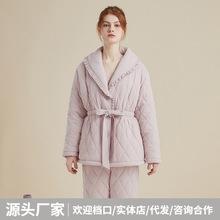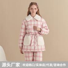 Pijama de inverno feminino de três camadas espessas e forradas com lã, jaqueta acolchoada de algodão tecido, outono e inverno, lã coral, estilo de inverno, super grossa, roupa de casa