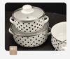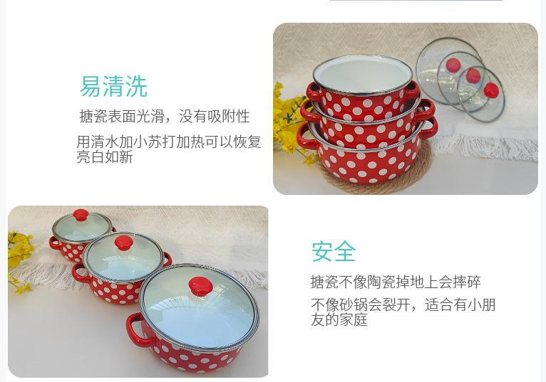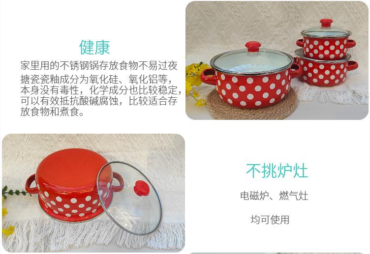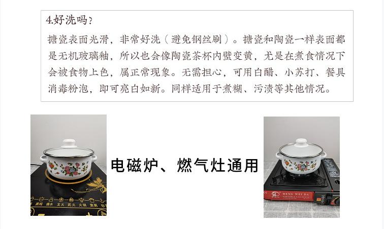 6. El esmalte se puede usar con gas natural, gas de hulla y cocinas de inducción, pero no con hornos microondas (Tenga en cuenta que las ollas bajas y las ollas con mangos de plástico no deben usarse con gas de hulla o gas natural, ya que es fácil quemar los mangos. Se recomienda usar una cocina de inducción.)