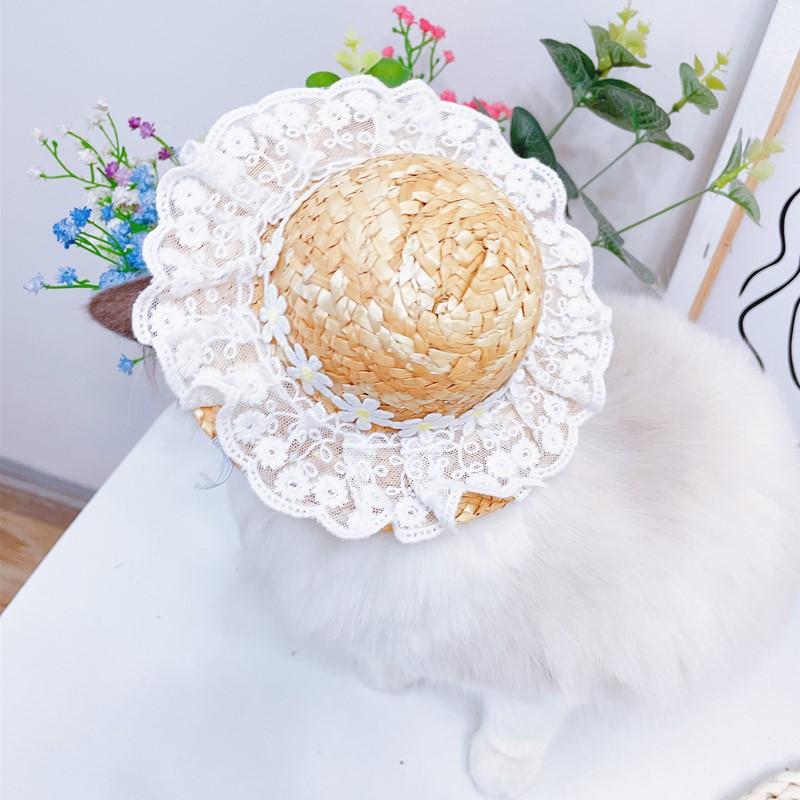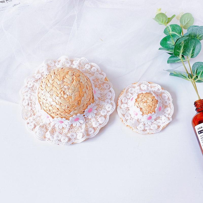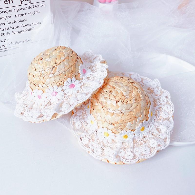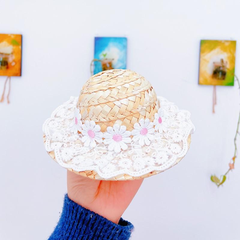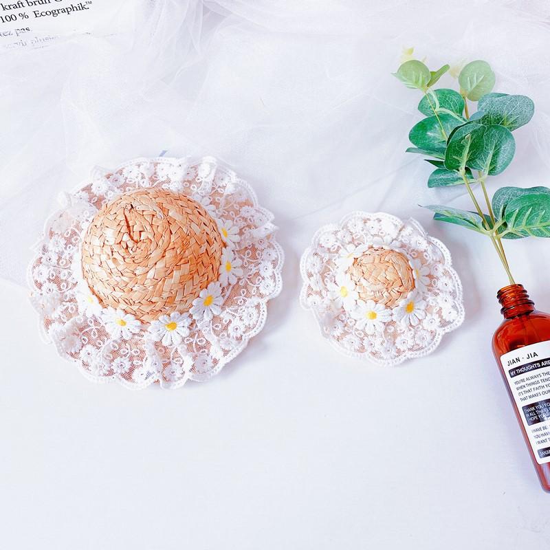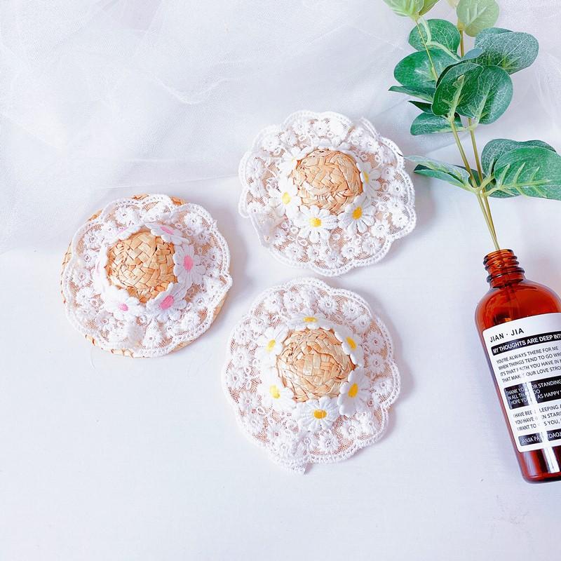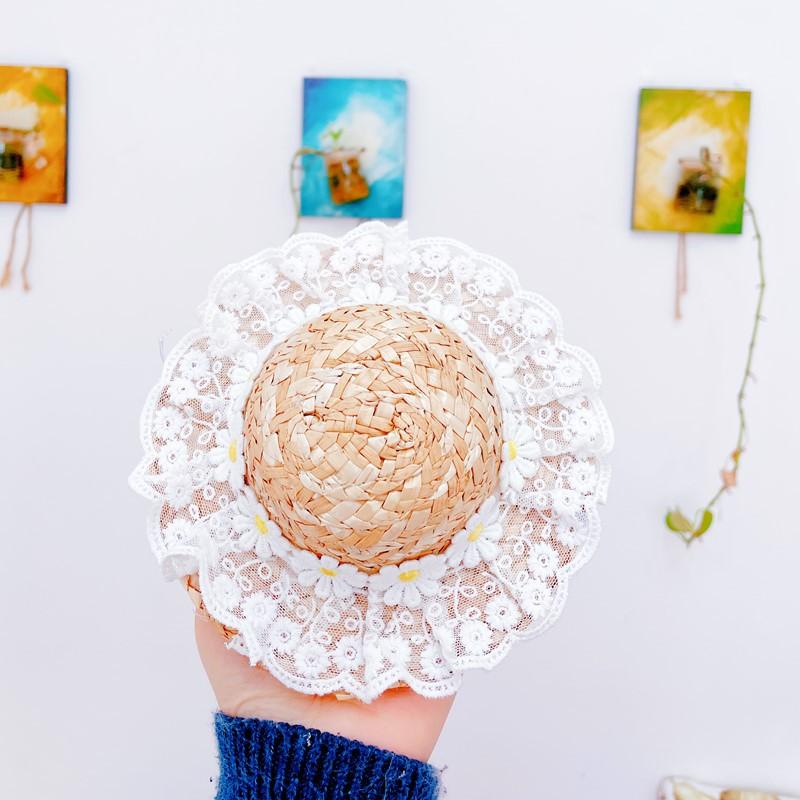 Chapéu de palha com flores de renda, renda branca com pequenas flores de margarida, fofo e brincalhão