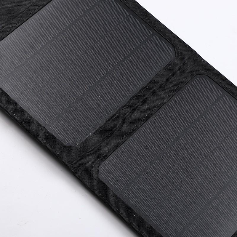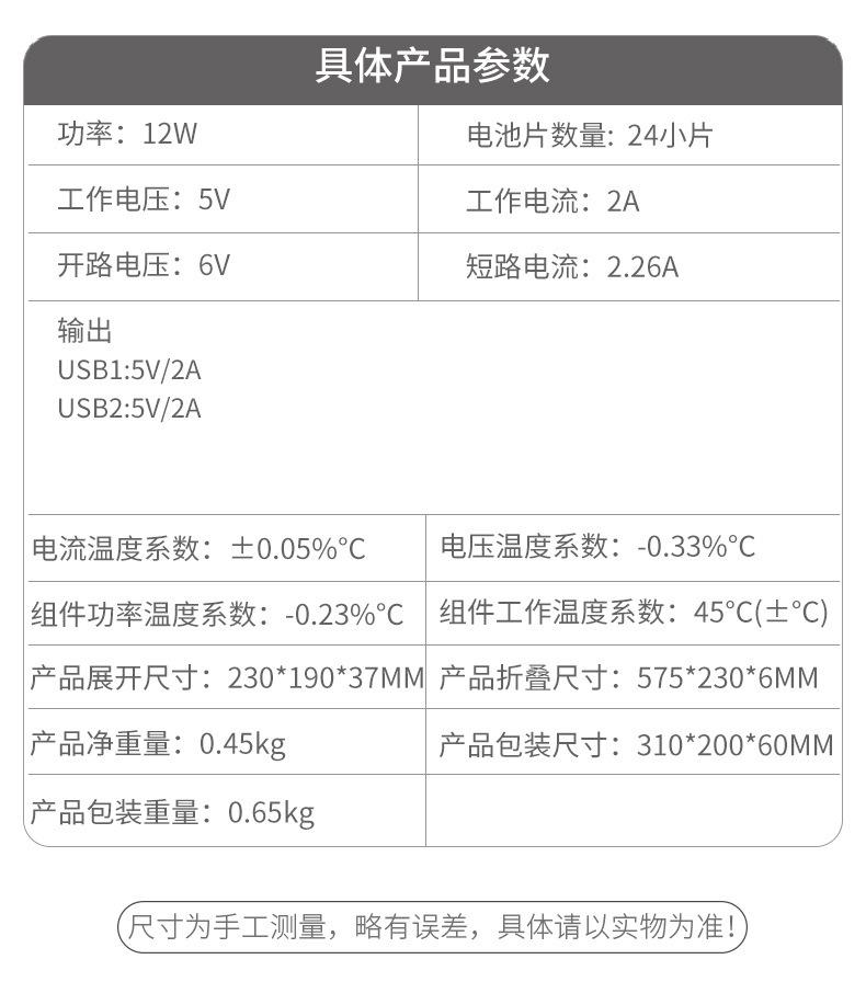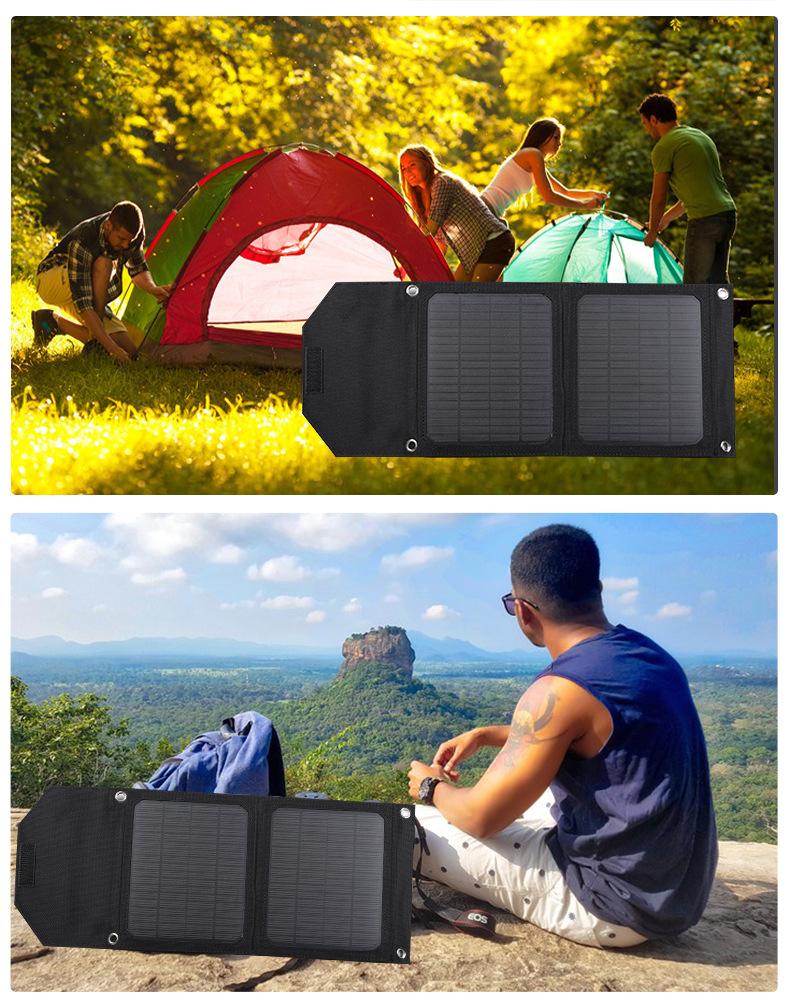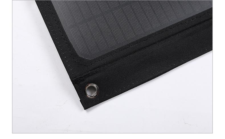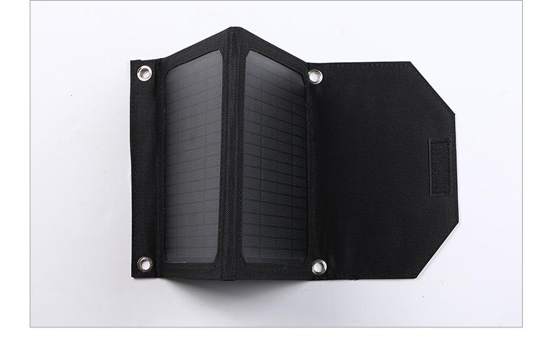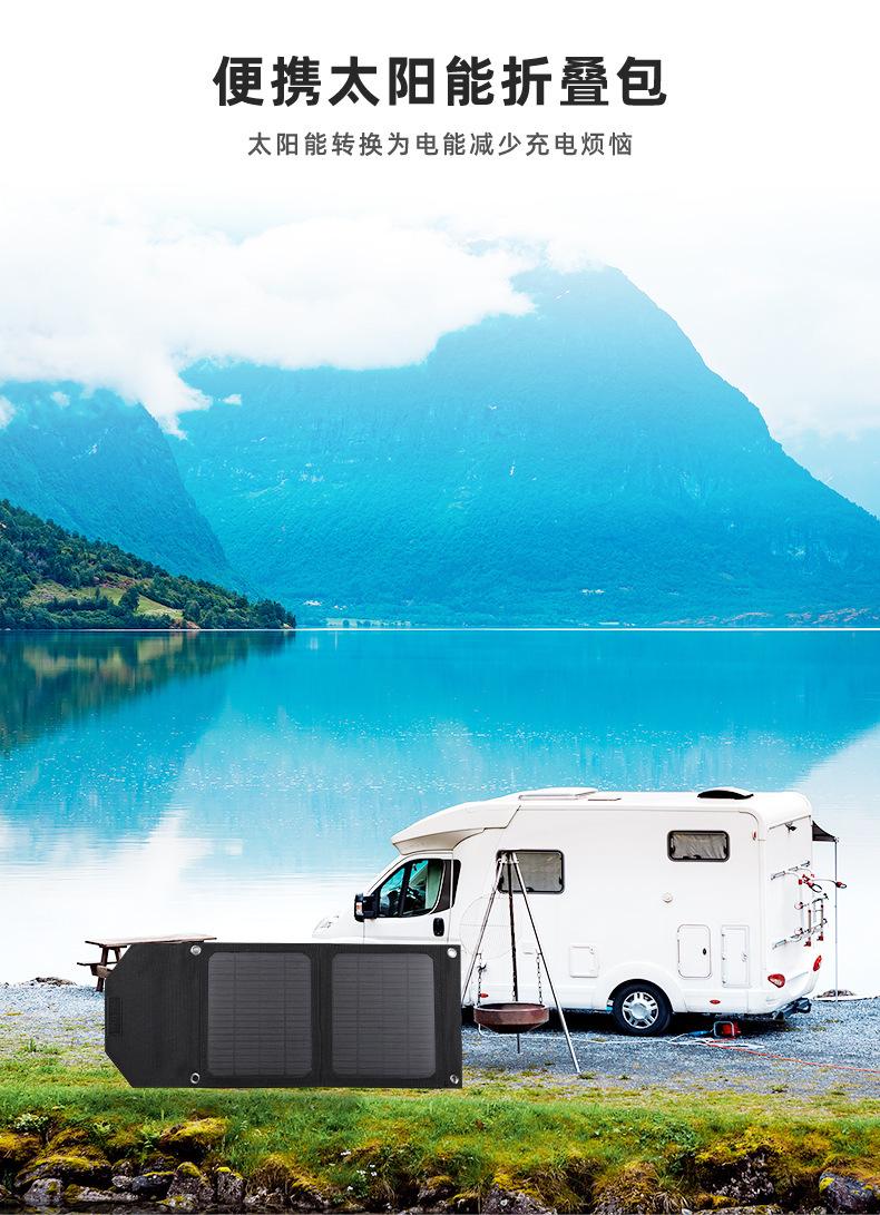 e. Design de bolsa dobrável portátil, com saída reguladora de voltagem USB, pode carregar diretamente dispositivos de 5 V, compatível com dispositivos de 5 V, como celulares, câmeras digitais, MP3, etc., não pode fornecer energia para dispositivos de 12 V.