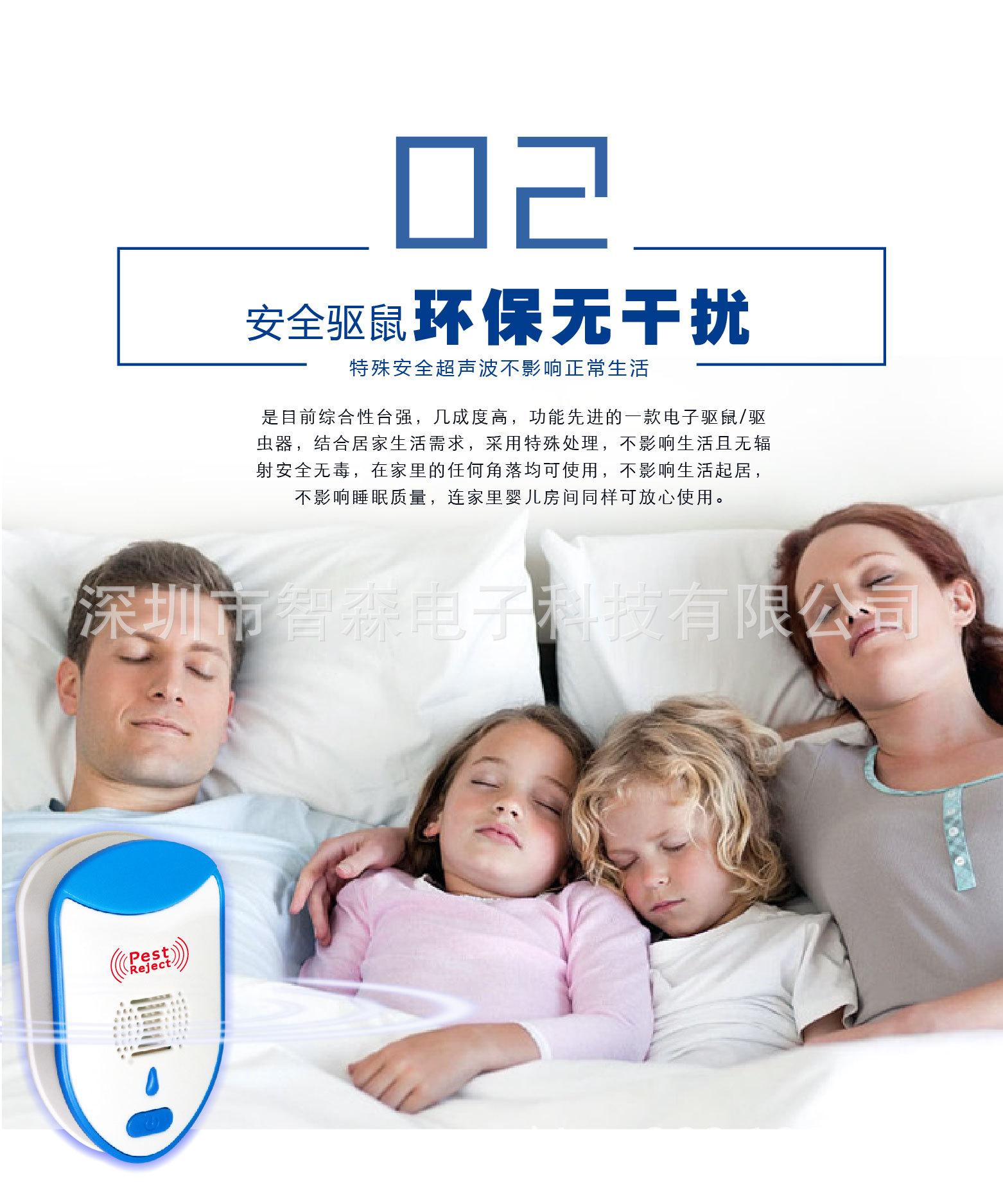 El repelente electrónico de insectos para el hogar es un nuevo producto electrónico de alta tecnología. Adopta un circuito ultrasónico de alta frecuencia de barrido para generar ondas ultrasónicas de barrido de frecuencia de 20~65KHZ. Los mosquitos, las cucarachas, los ratones y otras plagas tendrán su sistema endocrino y sus funciones fisiológicas alterados dentro del rango de ondas sonoras de esta frecuencia, logrando así el efecto de repelerlos y matarlos. Las ondas ultrasónicas son dañinas para los humanos y otros animales porque los humanos no pueden oír ondas sonoras por encima de 20KHZ.