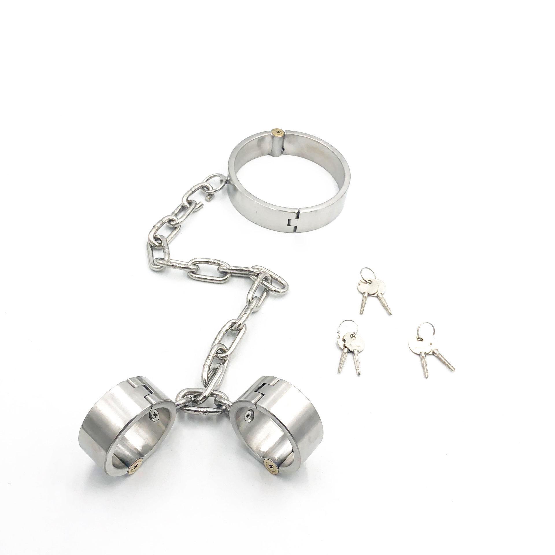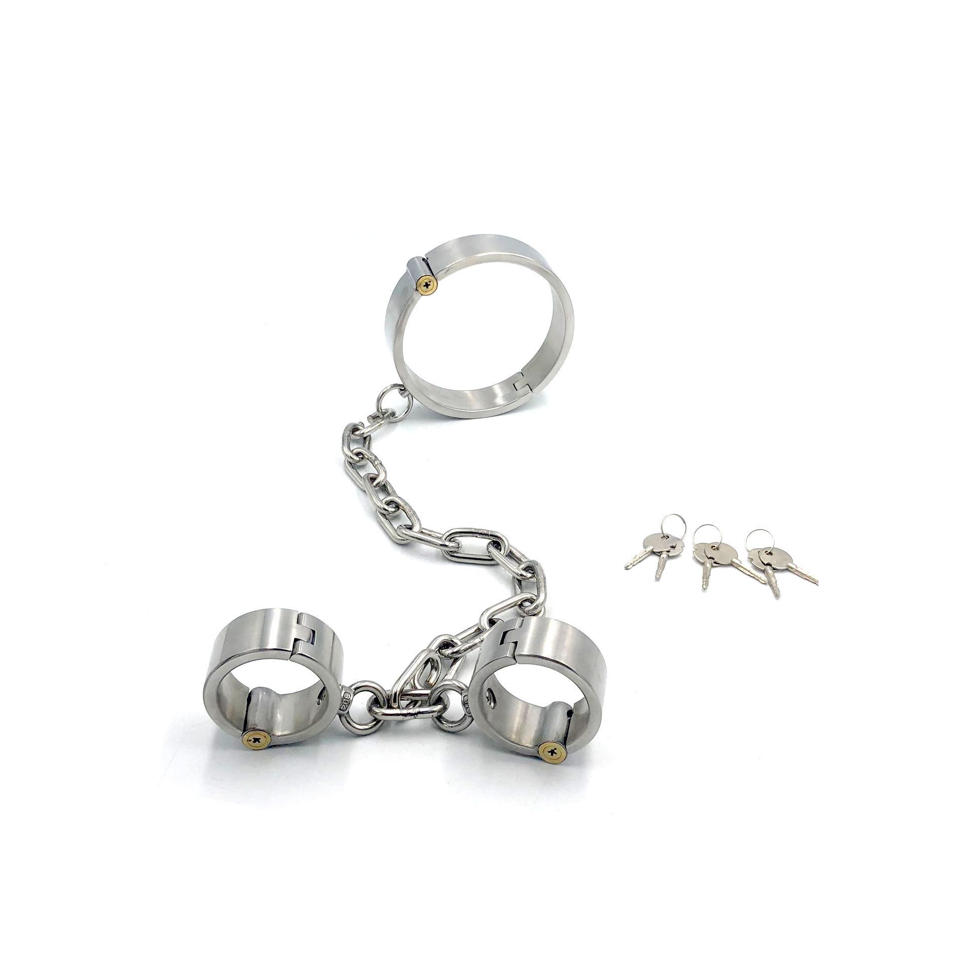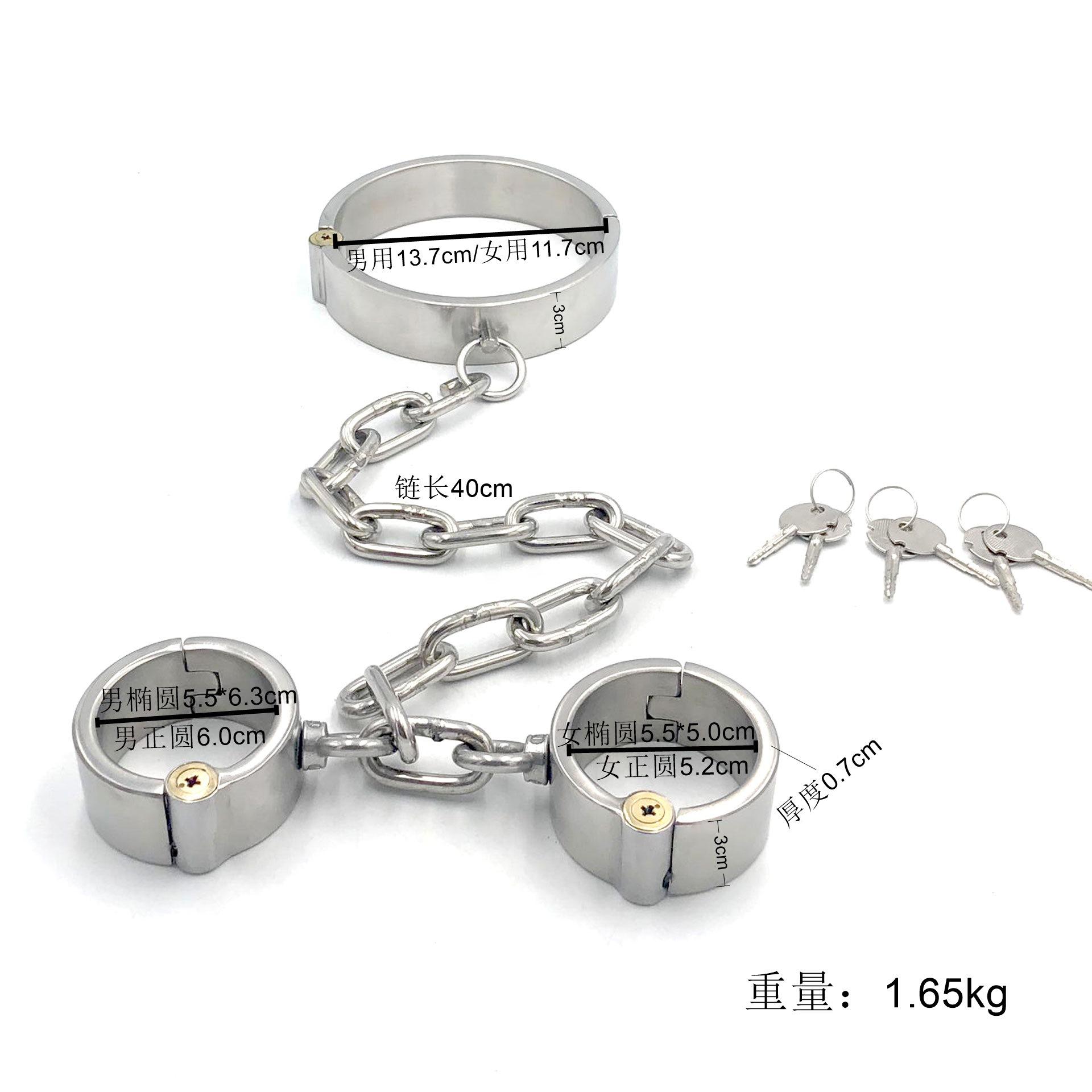 Tamanho: Diâmetro interno da coleira masculina 13,7 cm altura 3 cm espessura 0,7 cm Diâmetro interno redondo das algemas masculinas 6,0 cm Algemas ovais cerca de 6,3 * 5,5 cm Diâmetro interno da coleira feminina 11,7 cm altura 3 cm espessura 0,7 cm Algemas redondas femininas 5,2 cm Algemas ovais cerca de 5,5 * 5,0 cm altura 3,0 cm espessura 0,7 cm Comprimento da corrente da coleira para algema 40 m Comprimento da corrente da algema 5 cm
