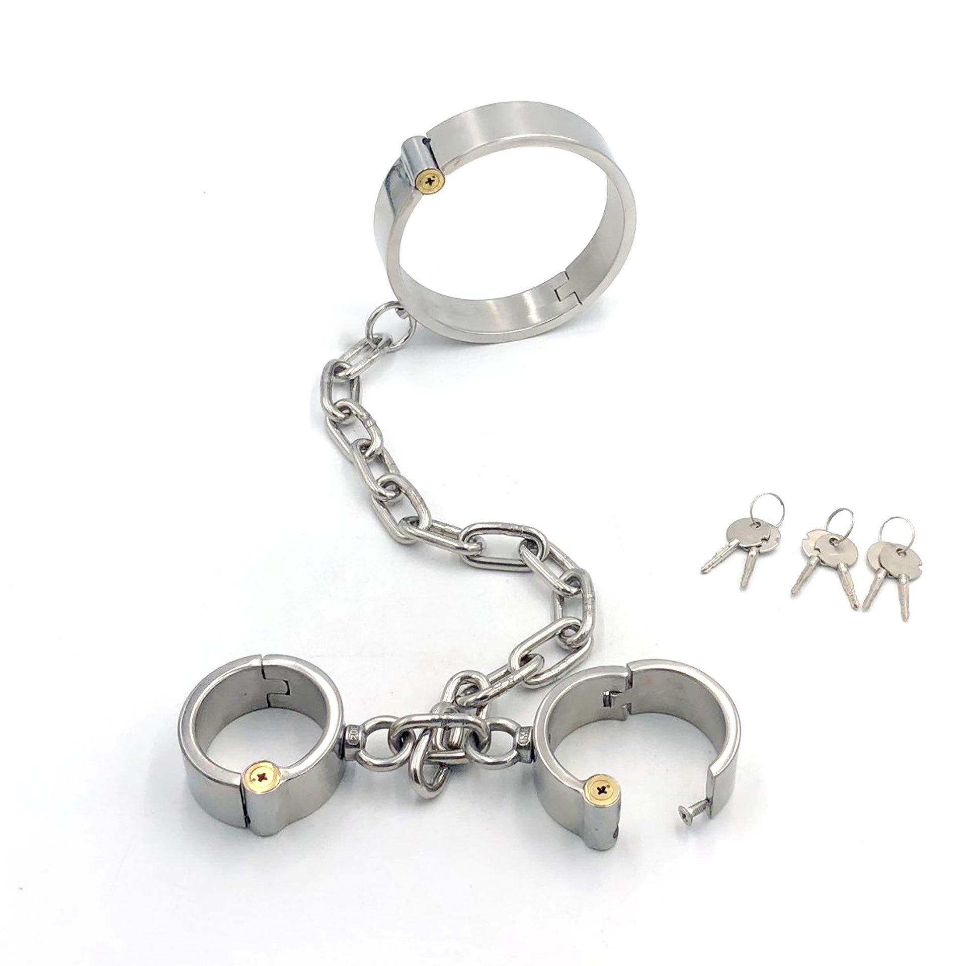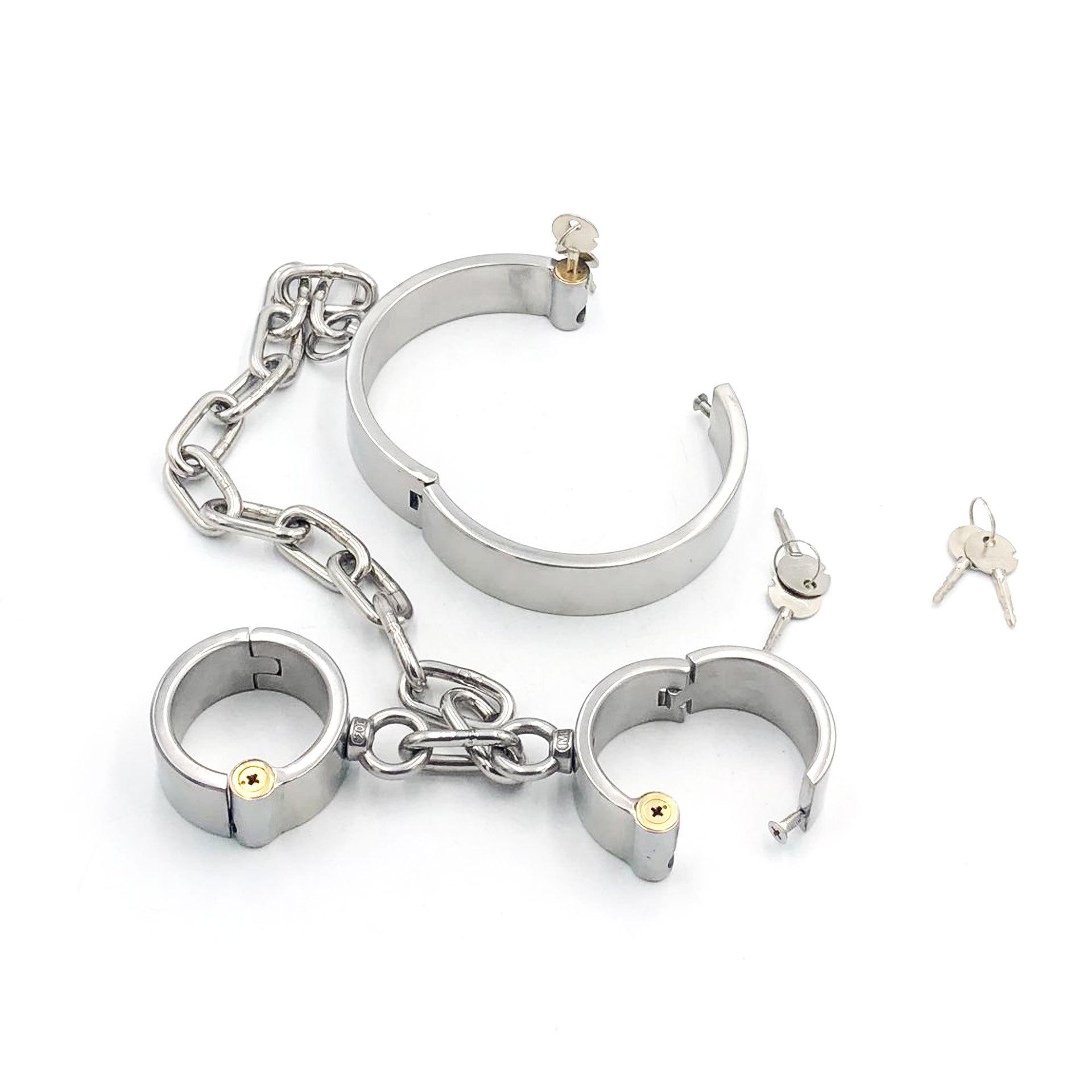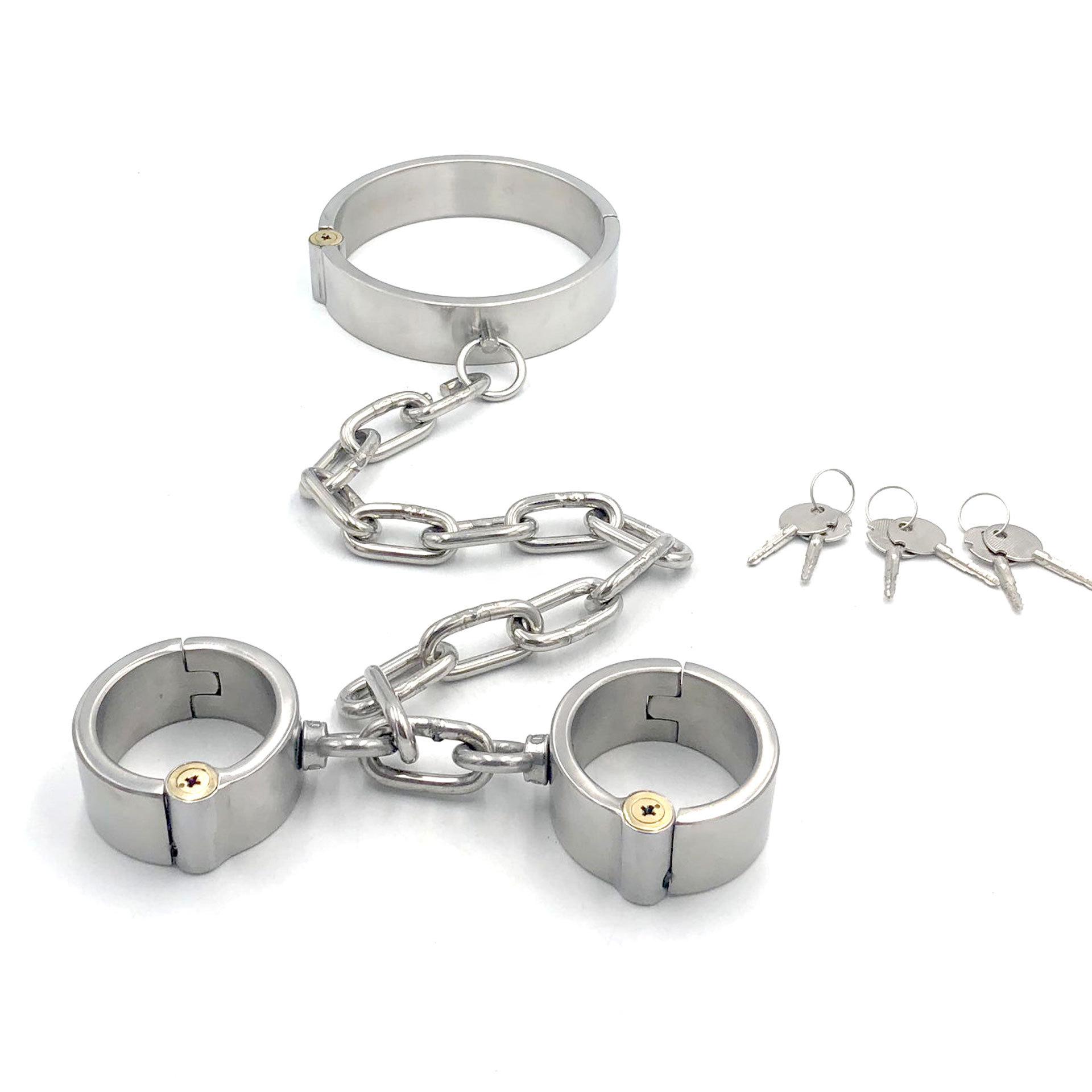 Tamanho: Diâmetro interno da coleira masculina 13,7 cm altura 3 cm espessura 0,7 cm Diâmetro interno redondo das algemas masculinas 6,0 cm Algemas ovais cerca de 6,3 * 5,5 cm Diâmetro interno da coleira feminina 11,7 cm altura 3 cm espessura 0,7 cm Algemas redondas femininas 5,2 cm Algemas ovais cerca de 5,5 * 5,0 cm altura 3,0 cm espessura 0,7 cm Comprimento da corrente da coleira para algema 40 m Comprimento da corrente da algema 5 cm