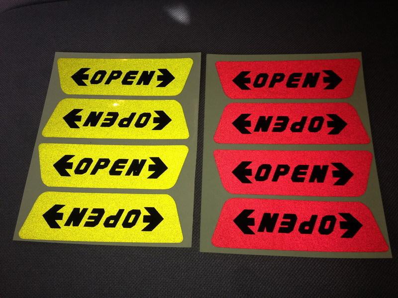 [Tipo de produto]: Adesivo de advertência, letras ABERTAS, disponível em fundo amarelo com letras pretas ou fundo vermelho com letras pretas