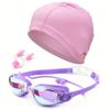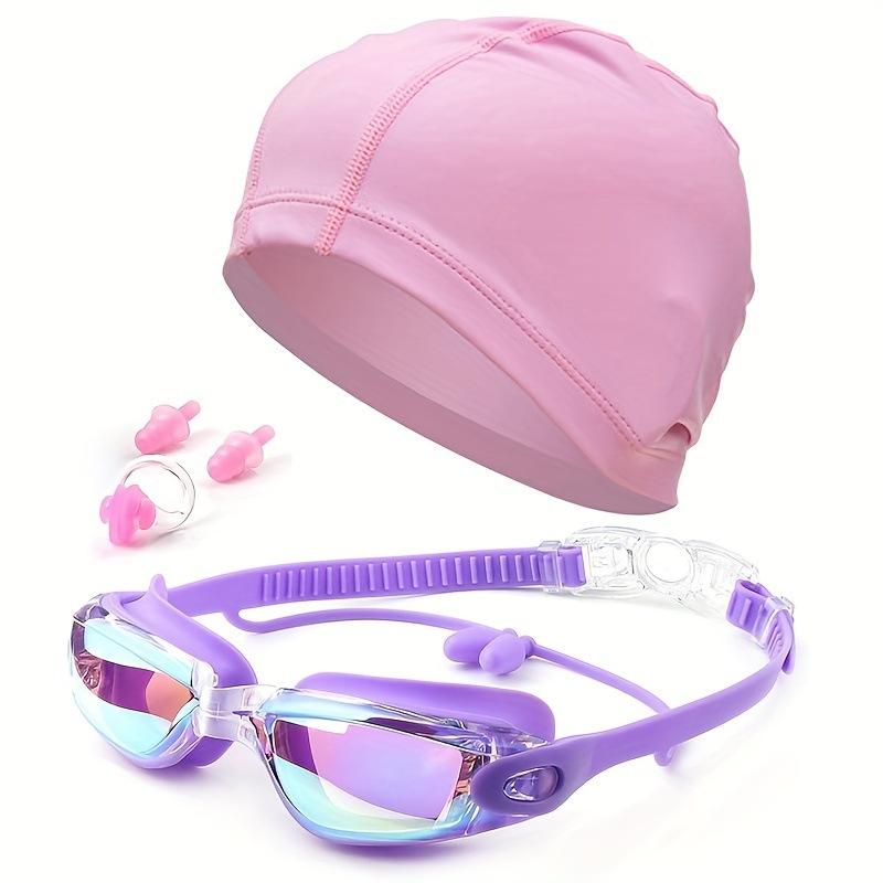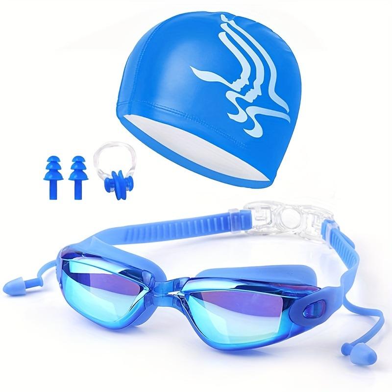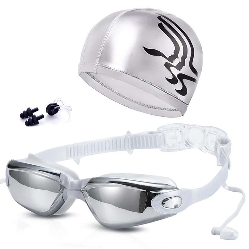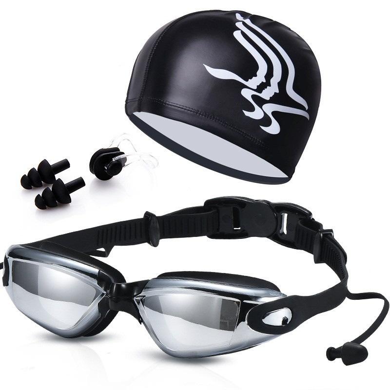Óculos de natação antiembaçantes galvanizados para homens e mulheres adultos transfronteiriços + protetores auriculares de silicone com clipe nasal + conjunto combinado de touca de natação de PU 7001 bolsas