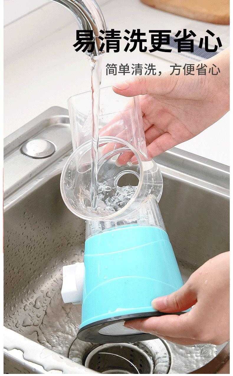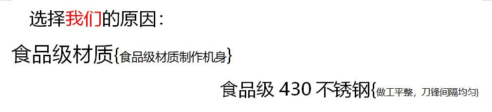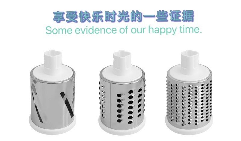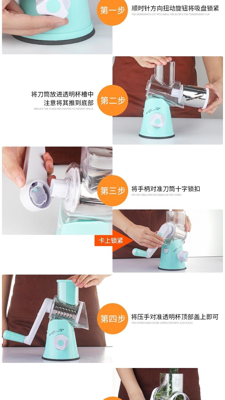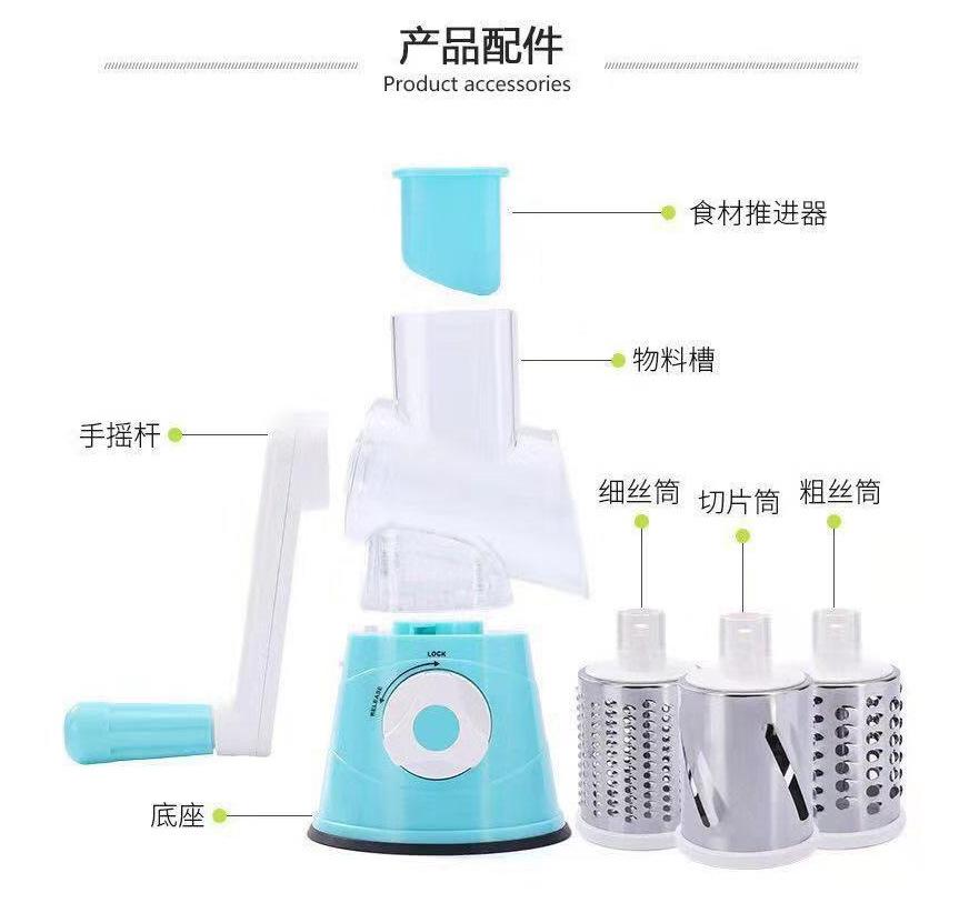 Composição do produto: base de ventosa, empurrador de alimentos, manivela, porta de alimentação de alimentos, cilindro de faca de corte, cilindro de faca de trituração, cilindro de faca de corte de tiras, manual de instruções em inglês + embalagem em caixa colorida em inglês.