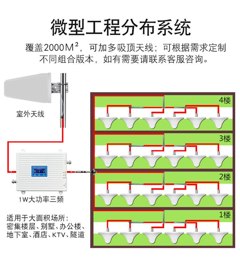 1. Adequado para amplificação de sinal de ponto cego em vários locais internos, como salas de conferências, hotéis e andares inferiores de grandes edifícios.