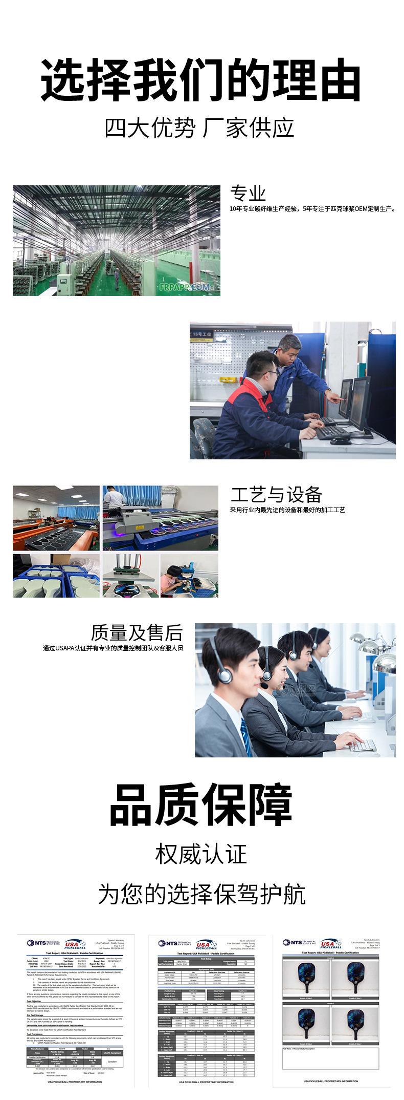 Especializados en la producción de raquetas de pickleball, fibra de carbono, fibra de vidrio, raquetas de pickleball de madera, todas se pueden personalizar, admitimos pruebas de una sola pieza