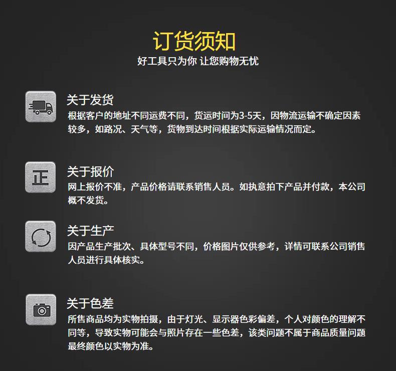 1. O preço do pedido padrão dos nossos produtos não inclui pontos de imposto, e os pontos de imposto serão adicionados ao faturar. Para detalhes, consulte o serviço de atendimento ao cliente da Wangwang! 2. O preço na página é apenas para referência. Por favor, consulte o preço real para consulta. 3. Como o peso dos produtos é diferente, é impossível marcar o frete claramente. Se o frete marcado aqui precisar ser modificado, entre em contato com nosso serviço de atendimento ao cliente Wangwang! |