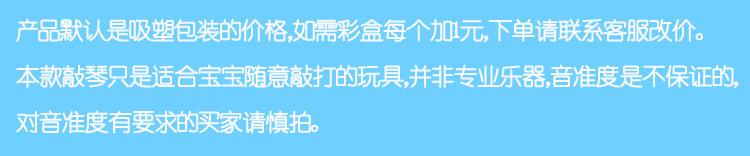 Consejos: Este piano de percusión viene con un par de baquetas y una partitura. El tono no es muy bueno, solo es adecuado para que los bebés jueguen casualmente, no lo toque si necesita tocarlo con precisión.