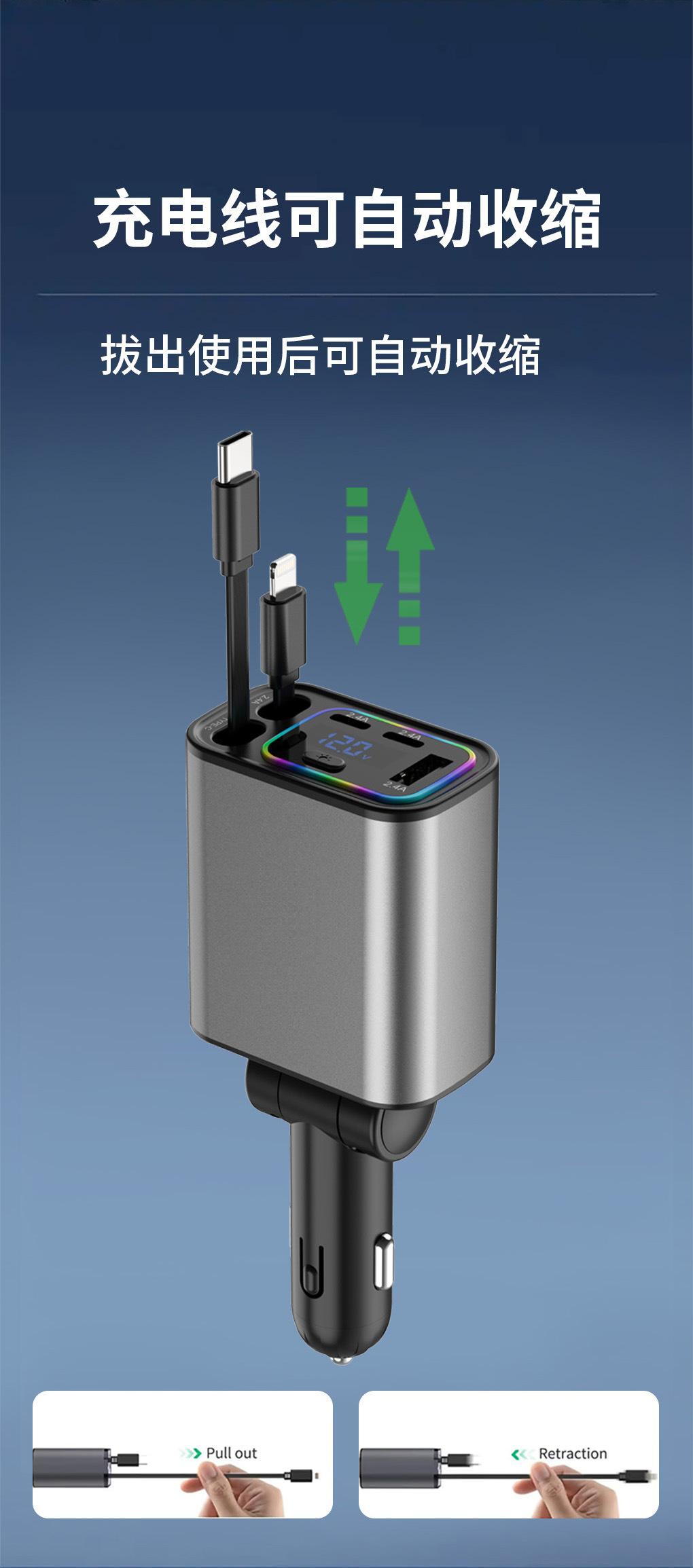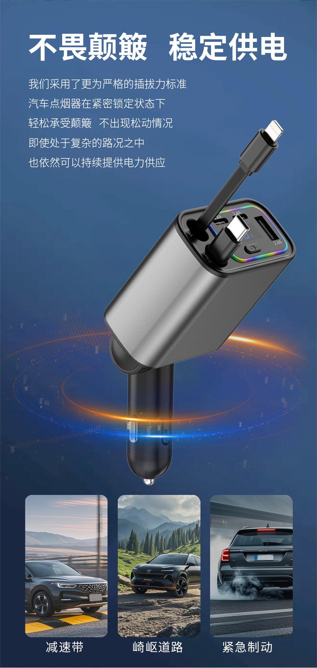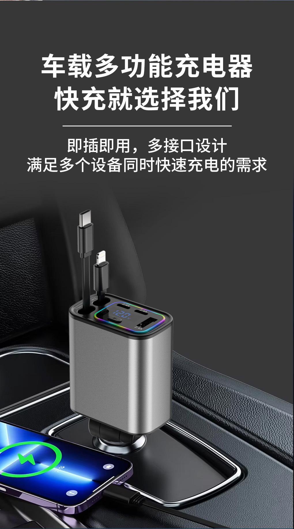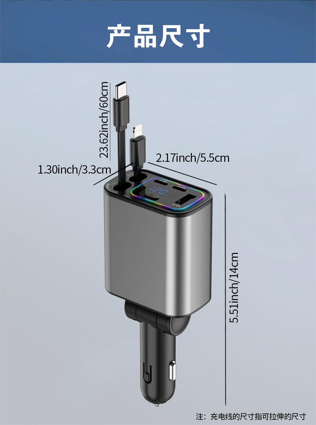 Características: Apariencia nueva y novedosa, luces coloridas, universal para modelos de 12-24V. Longitud del cable de carga uno a dos 60CM (cabezal Android, cabezal TYPE-C, cabezal Apple, PD). Soporta carga uno a tres, compartiendo la salida total 5V3A de carga rápida.