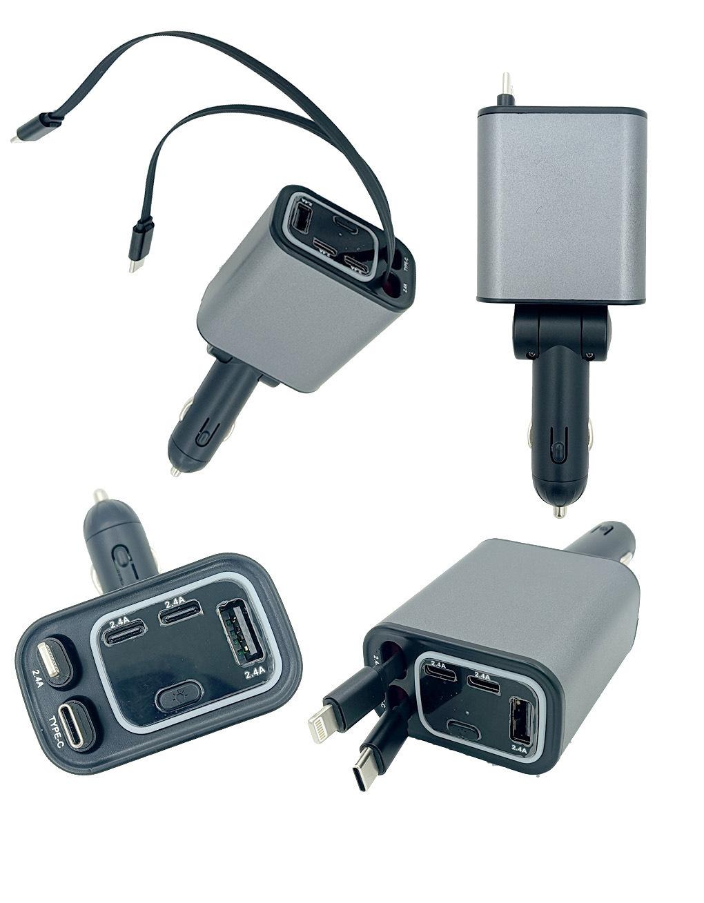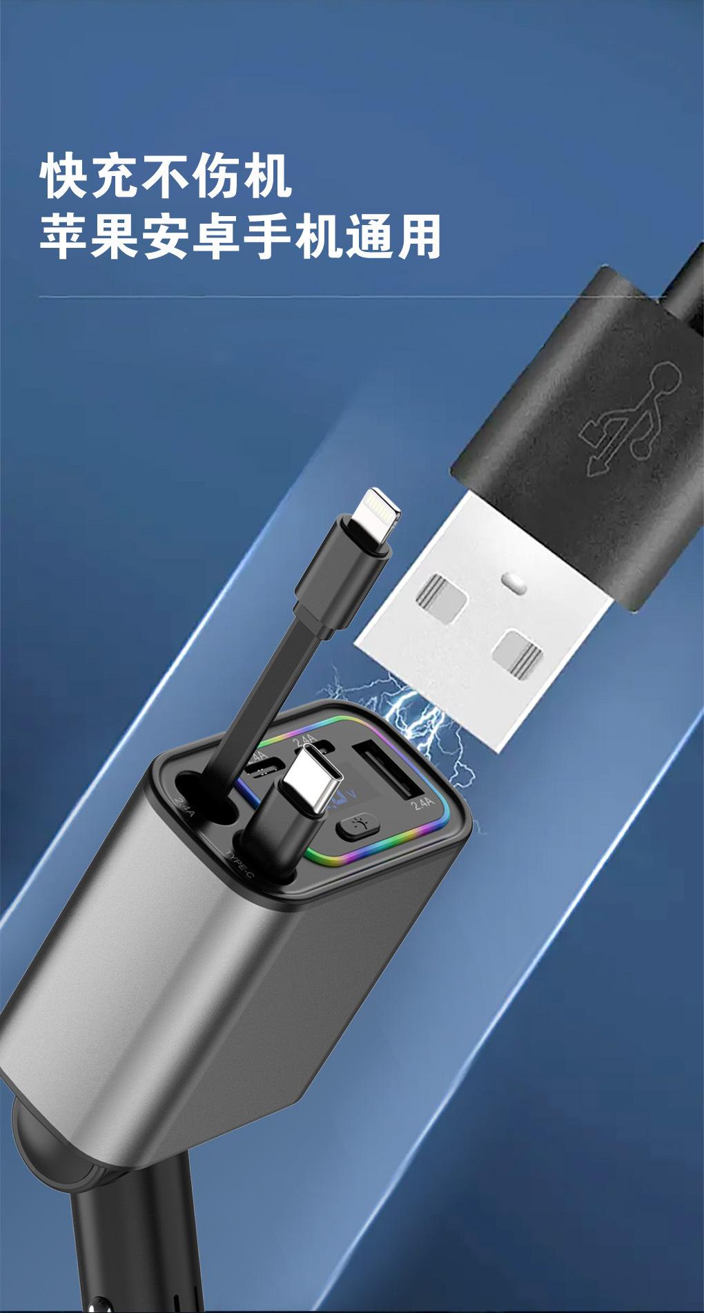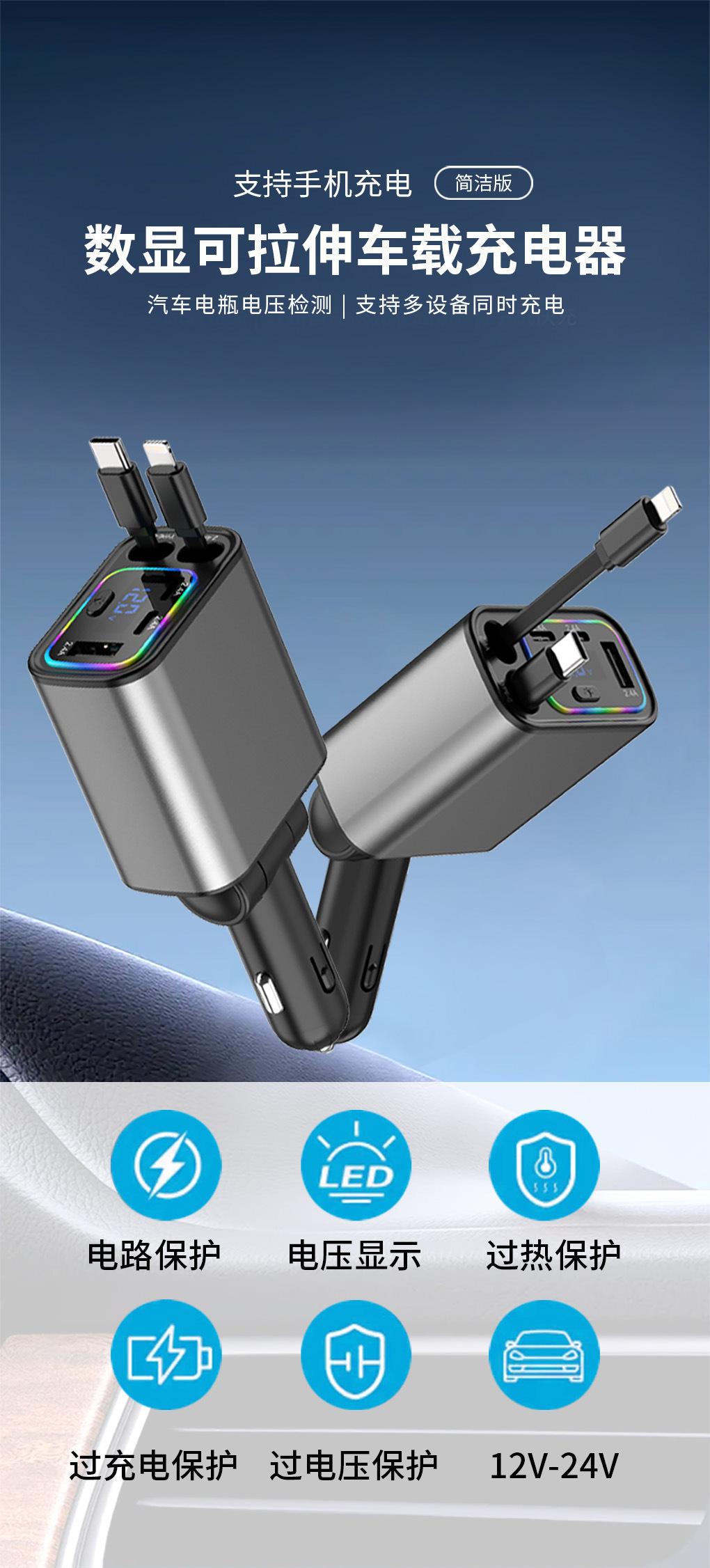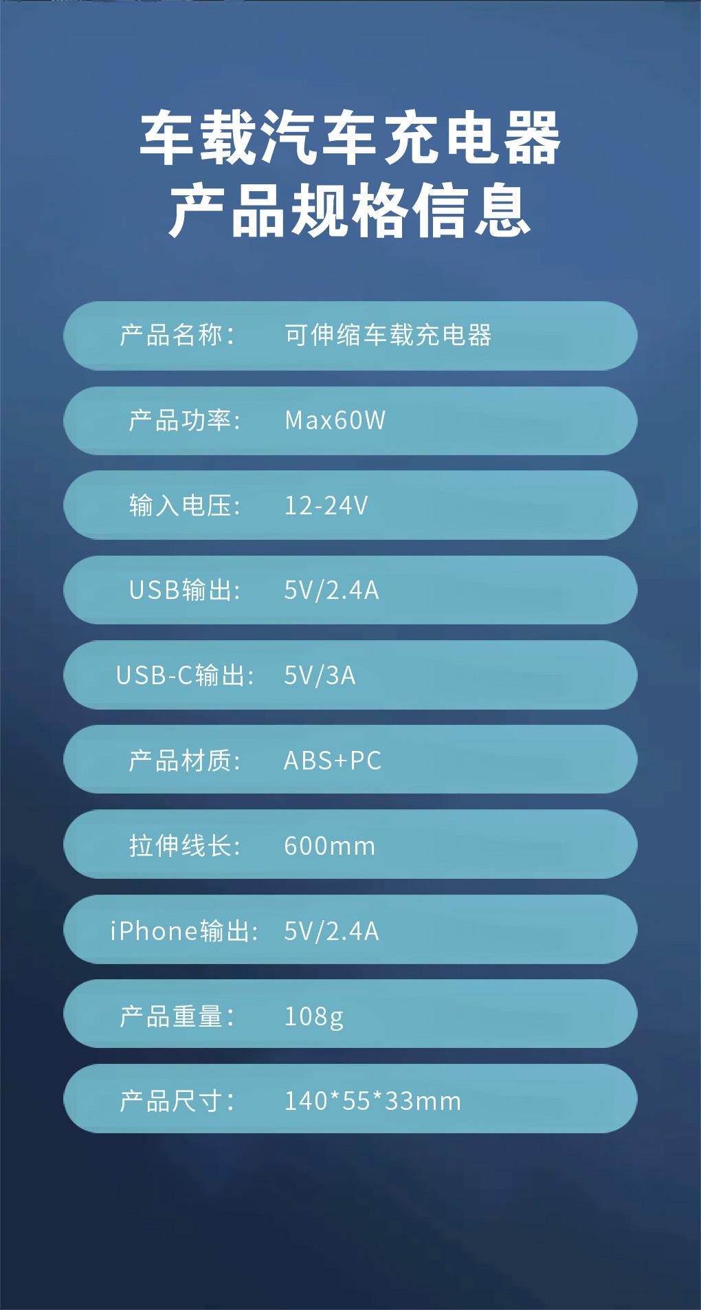 Características: Apariencia nueva y novedosa, luces coloridas, universal para modelos de 12-24V. Longitud del cable de carga uno a dos 60CM (cabezal Android, cabezal TYPE-C, cabezal Apple, PD). Soporta carga uno a tres, compartiendo la salida total 5V3A de carga rápida.
