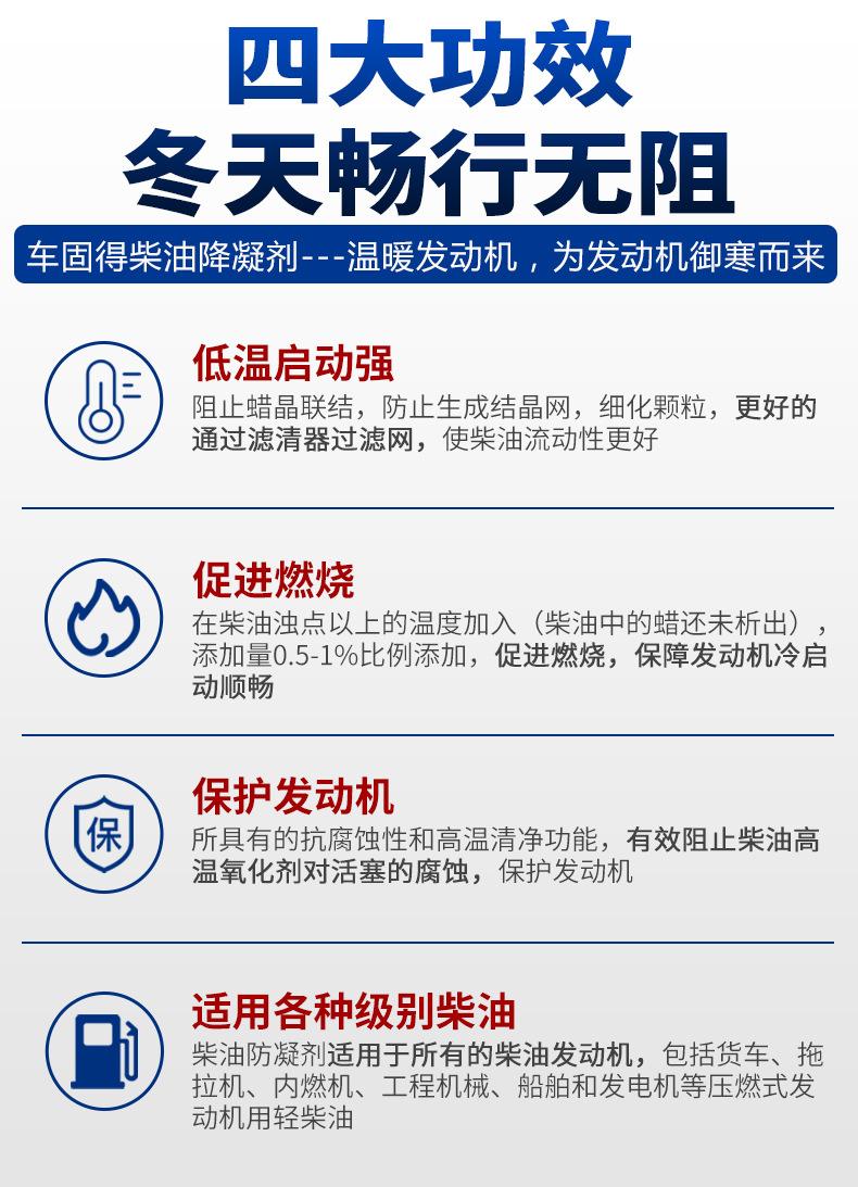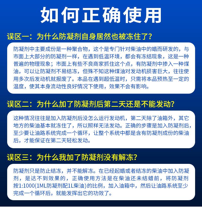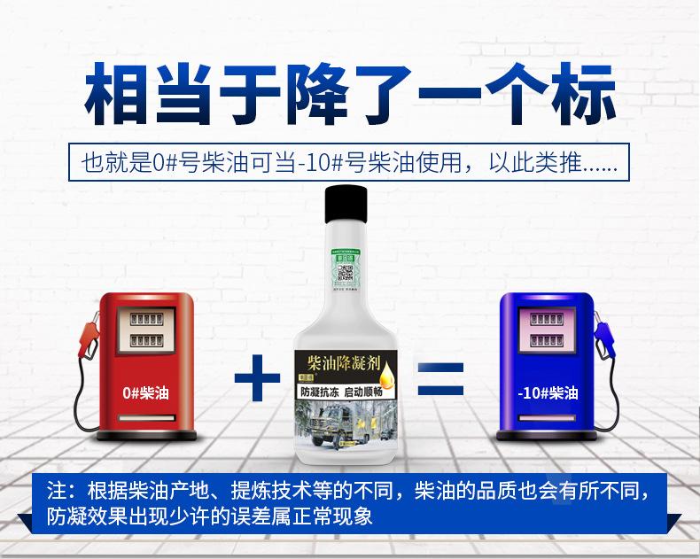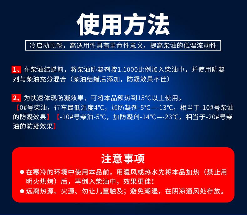 Adicione este produto antes das ceras diesel e depois adicione óleo combustível na proporção de 1:1000.Uma garrafa pode ser misturada com cerca de 300L de diesel(Aplicável a 0#, -10#, -20# e outros tipos de diesel. Após a adição, 0# pode se tornar -10#, -10# pode se tornar -20#, -20# pode se tornar -30# e assim por diante. O ponto de congelamento mais baixo pode ser reduzido para -31°C. Se a temperatura for inferior a menos 31°C, o uso deste produto não terá efeito anticoagulante.)