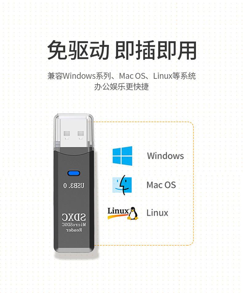 Este produto pode ler os cartões de memória SD/TF dos principais produtos digitais do mercado e transferi-los para computadores desktop ou laptop através da interface USB3.0.
