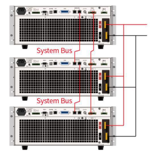 A série IT8900A/E tem as funções de conexão paralela mestre-escravo e compartilhamento de corrente ativa. Ela suporta conexão paralela de gabinetes com diferentes potências e a mesma voltagem. Após a conexão paralela, todas as funções de um único gabinete podem ser realizadas, incluindo operação no modo CV, e pode ser paralelizado até 600 kW. Um único gabinete também pode funcionar de forma independente, e a configuração de energia é mais flexível. Esta conexão paralela adota o método de fiação de quantidades analógicas e digitais separadamente, e o desempenho paralelo é mais estável.