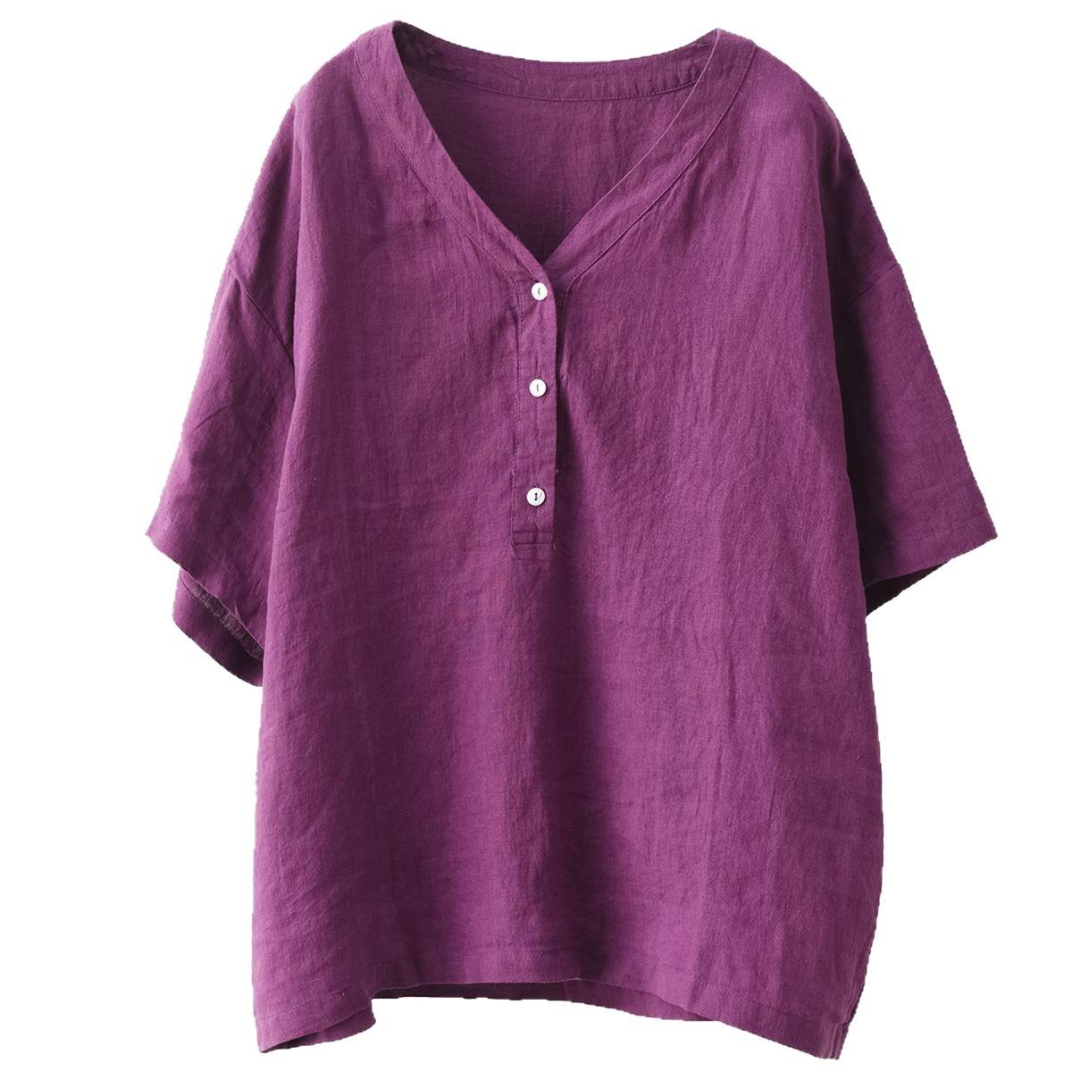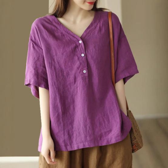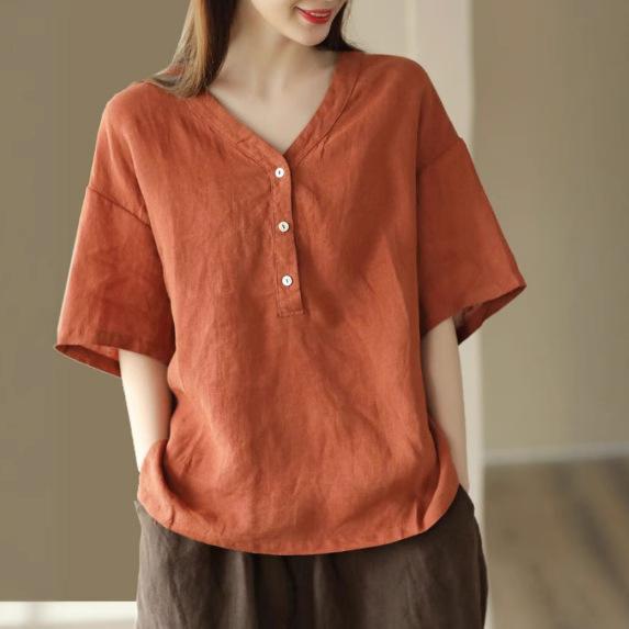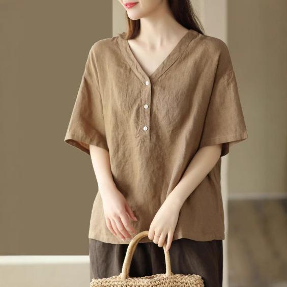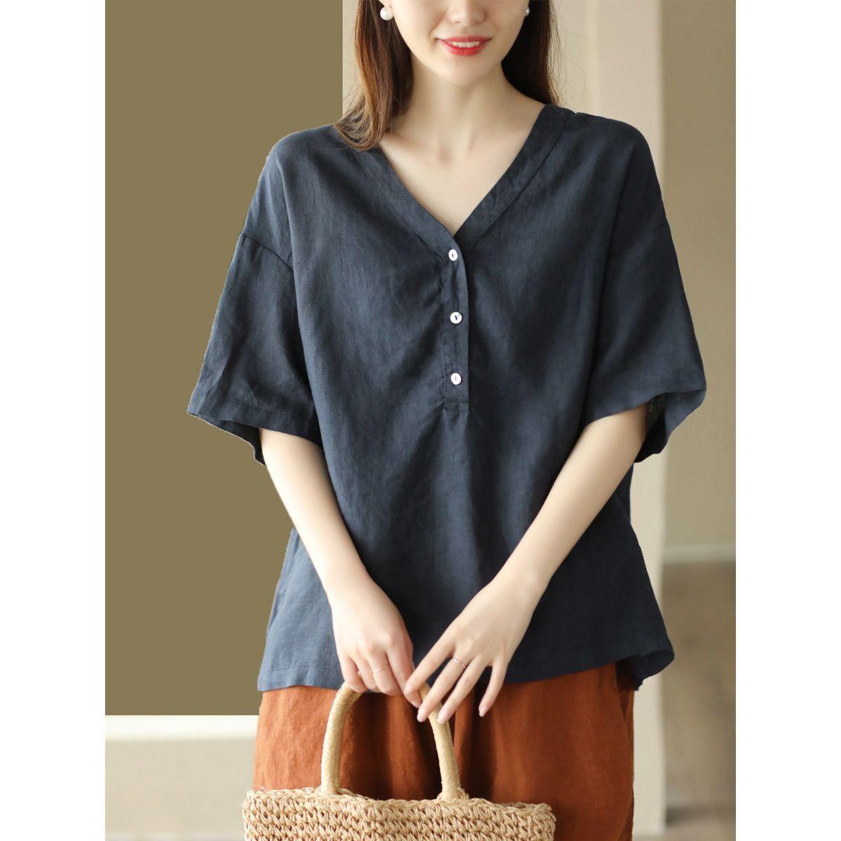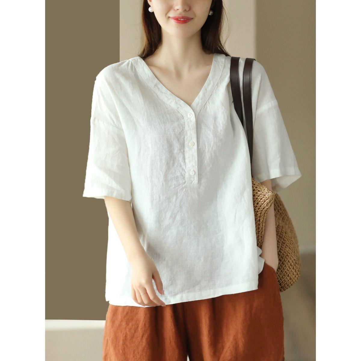 2025 Top Retro Cuello en V para Mujer Look Adelgazante Holgado Camiseta de Manga Corta Camiseta Holgada Verano Nuevo Versátil Verano Versátil
