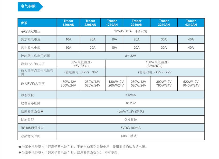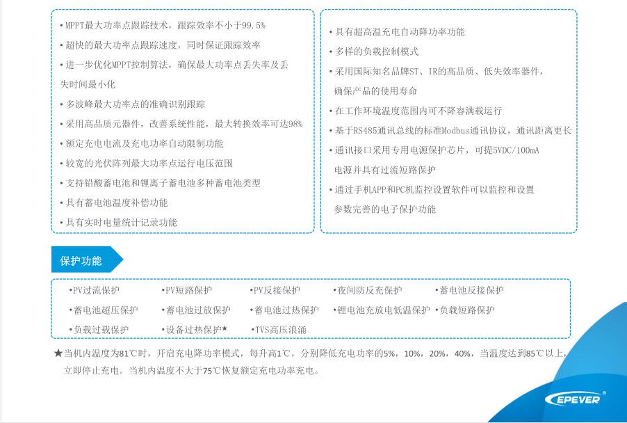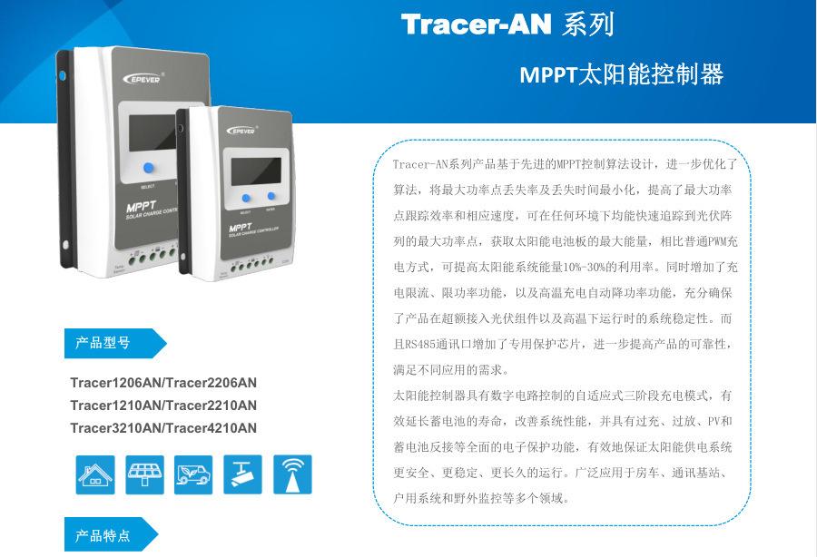 Tracer-AN tiene funciones de limitación de corriente y potencia, y no ocurrirá el fenómeno de sobretensión a alto o bajo voltaje. Por lo tanto, los clientes pueden conectar de forma segura módulos fotovoltaicos en exceso sin dañar el controlador.