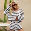 Conjunto Suéter Tricô Conjunto Duas Peças Listrado Suéter Shorts Moletom Com Capuz