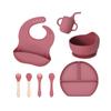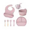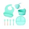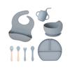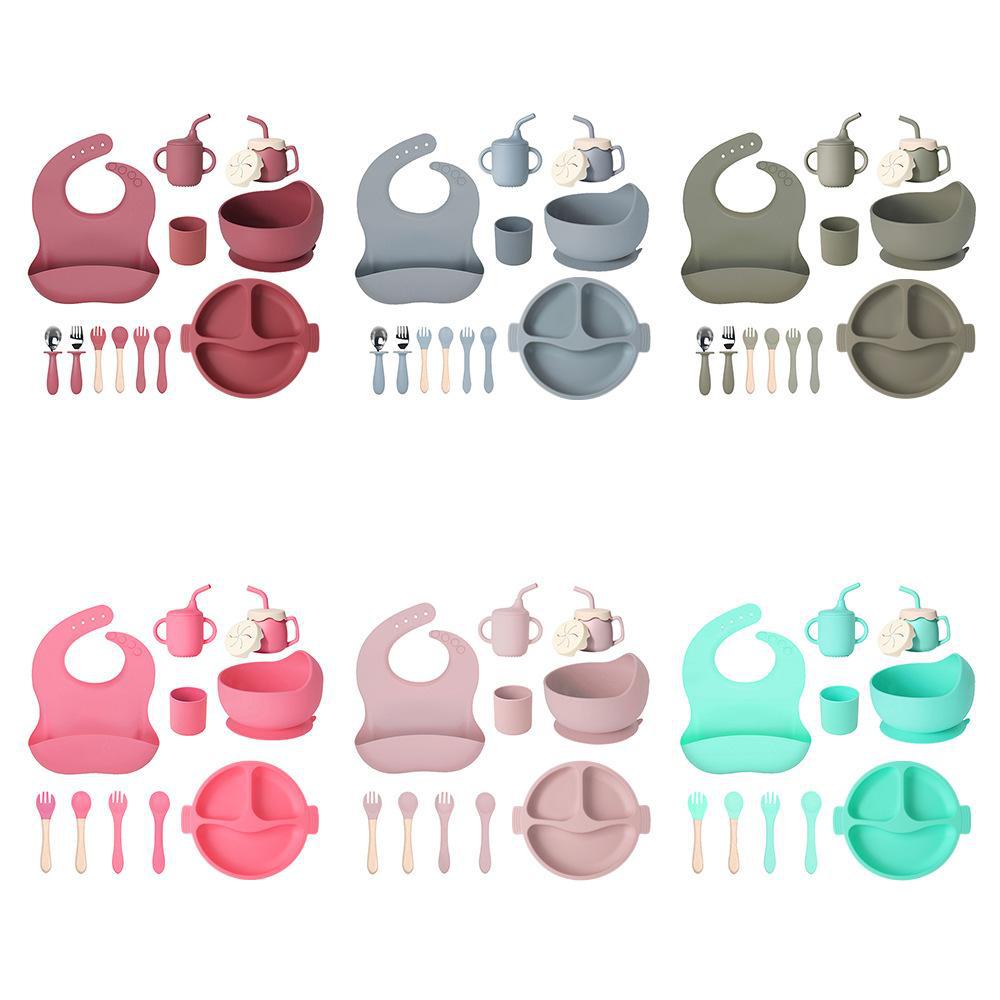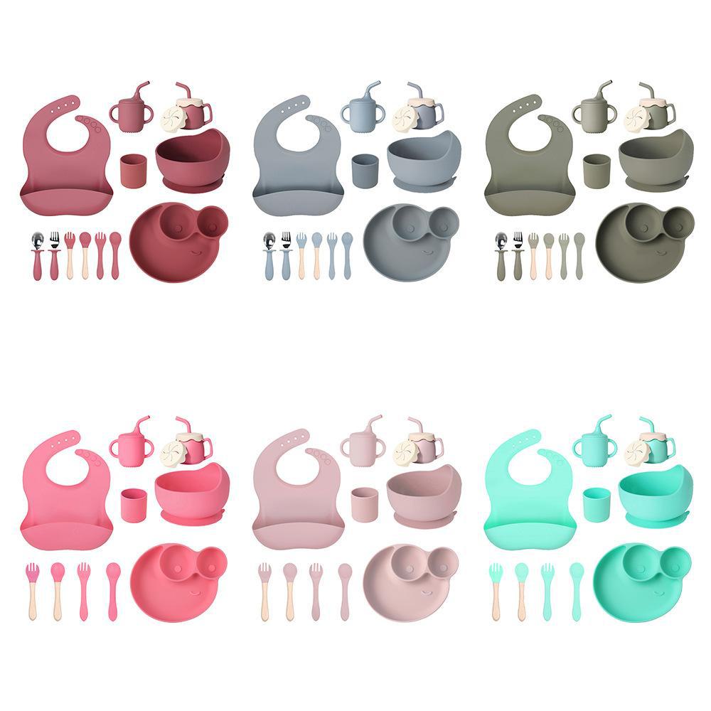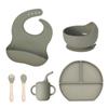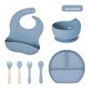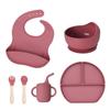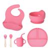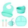 Conjunto de Louça de Silicone para Bebê 6 Peças Tigela de Silicone Infantil Ventosa Prato de Jantar Copo de Água Talheres de Cabo de Madeira Atacado Louça Pronta
